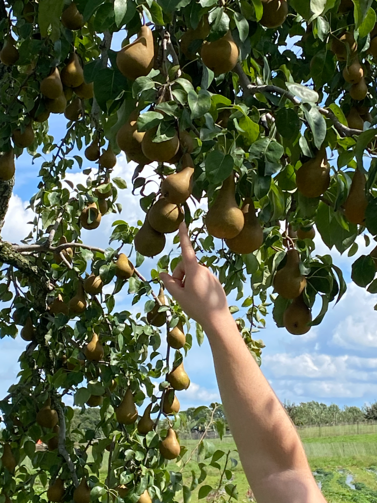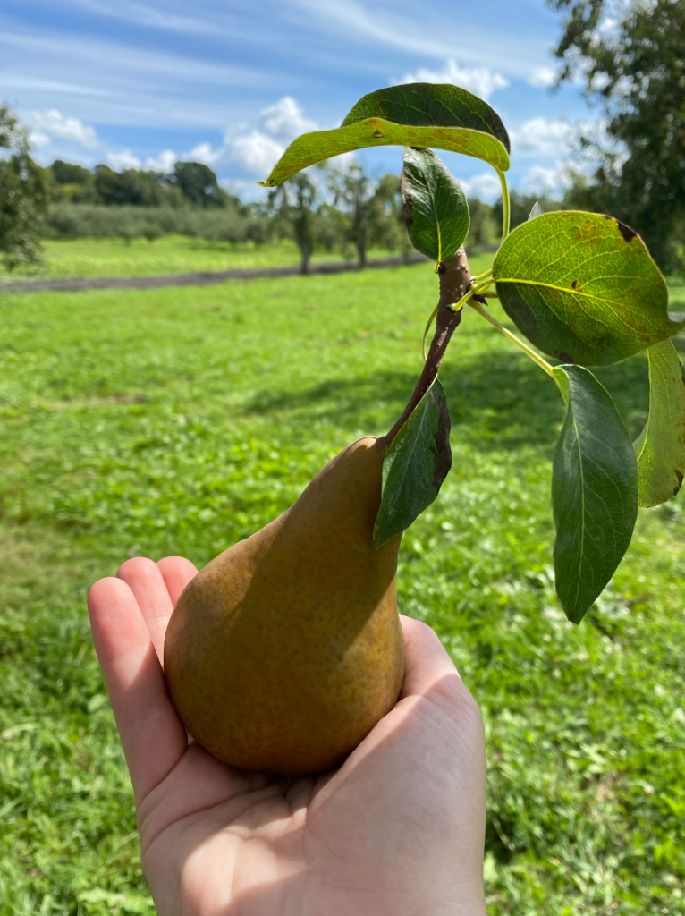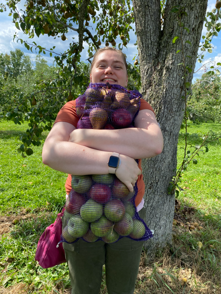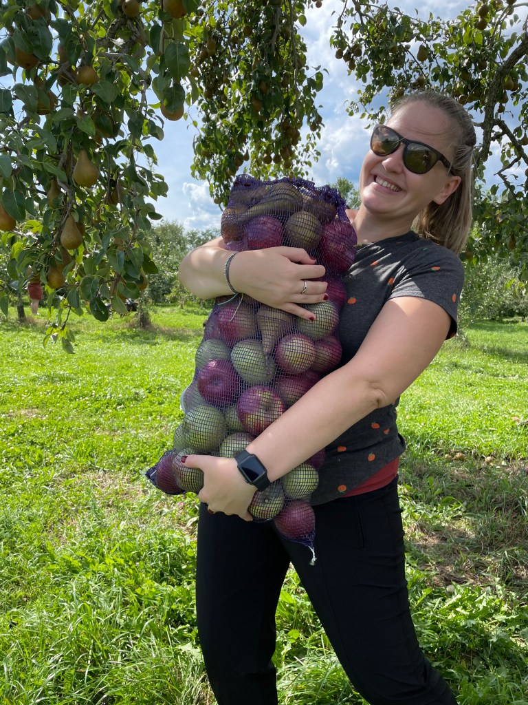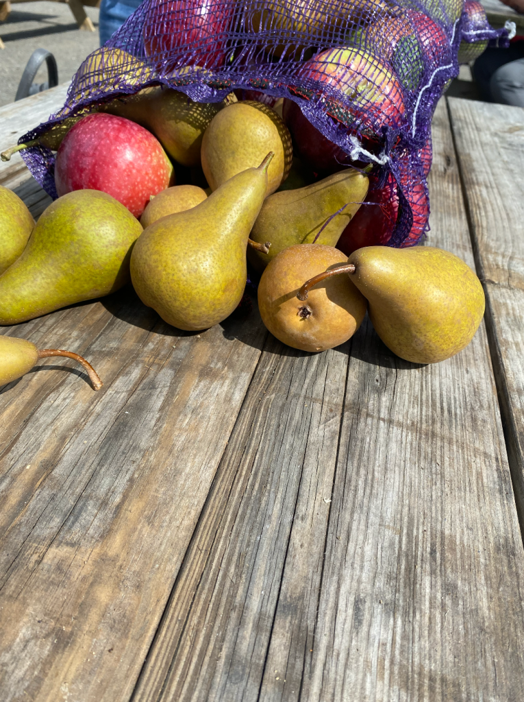 After the hay ride, we started our fruit picking. When we purchased the entry to the hay ride we also bought their large bag to collect the fruit in which cost $45 (so about $9 per person). This year, since we were so early in the season, we were also able to pick pears. Rather quickly we were able to fill the bag full of Gala, Cortland, and Mackintosh apples and Bosc pears. The bag was very heavy, so we all had to take turns carrying the bag back to the picnic tables.