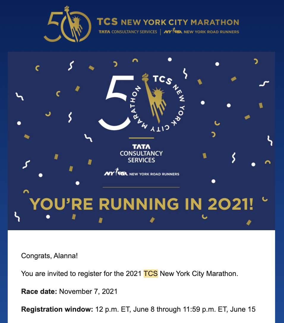 As 2021 started, I was keeping my eye on the NYRR social media because I was curious to see what the plan was for the marathon. As vaccines were announced, I was hoping that was good news for the 50th marathon. Finally, on May 19th, I received my email inviting me to sign up for the marathon. I emailed my boss to make sure I could have the day off since we started working on Sundays, and, thankfully, she gave me the go ahead. On June 8th, I waited in a brief virtual queue until I finally entered the site for registration and quickly entered my information.