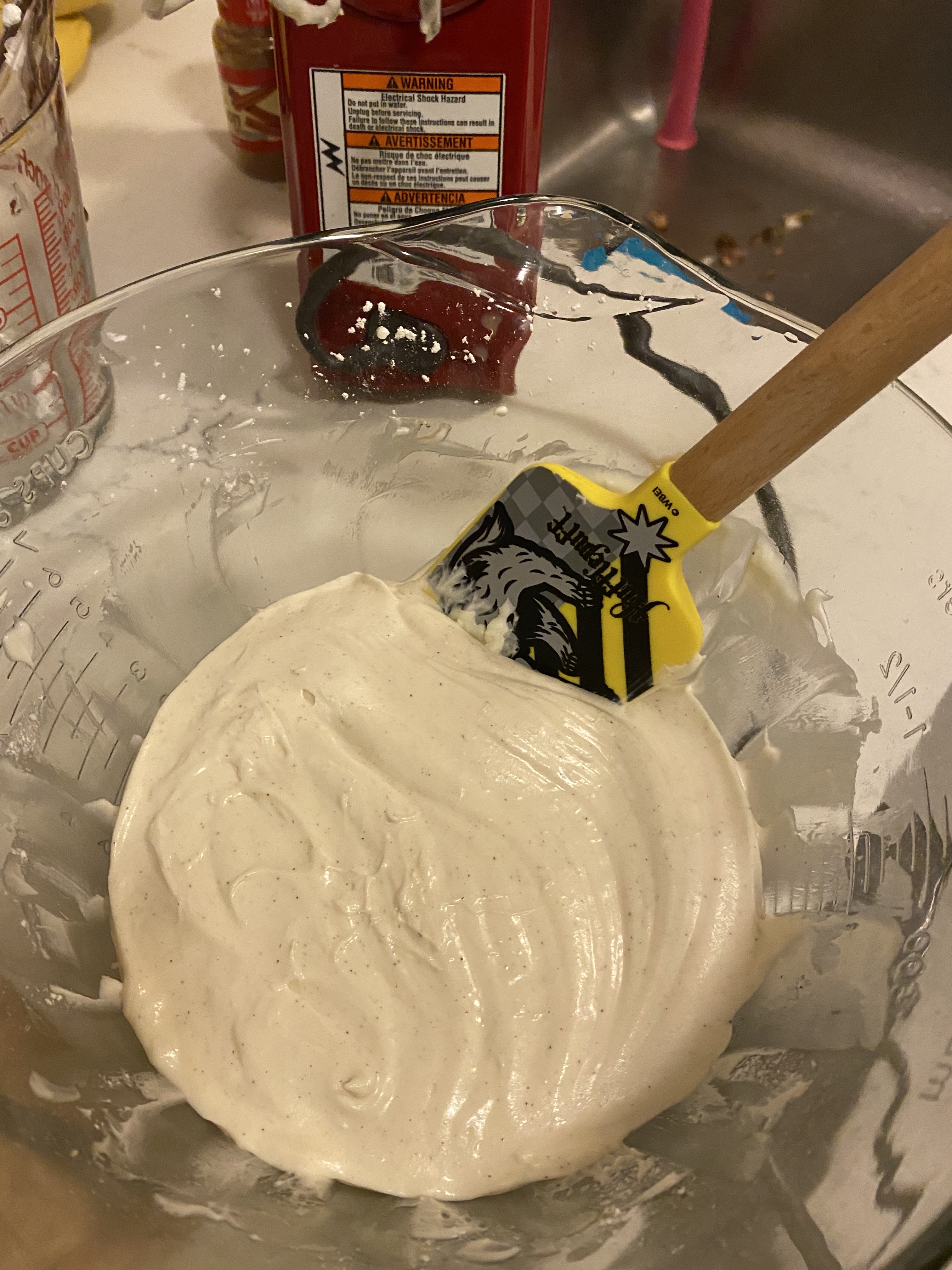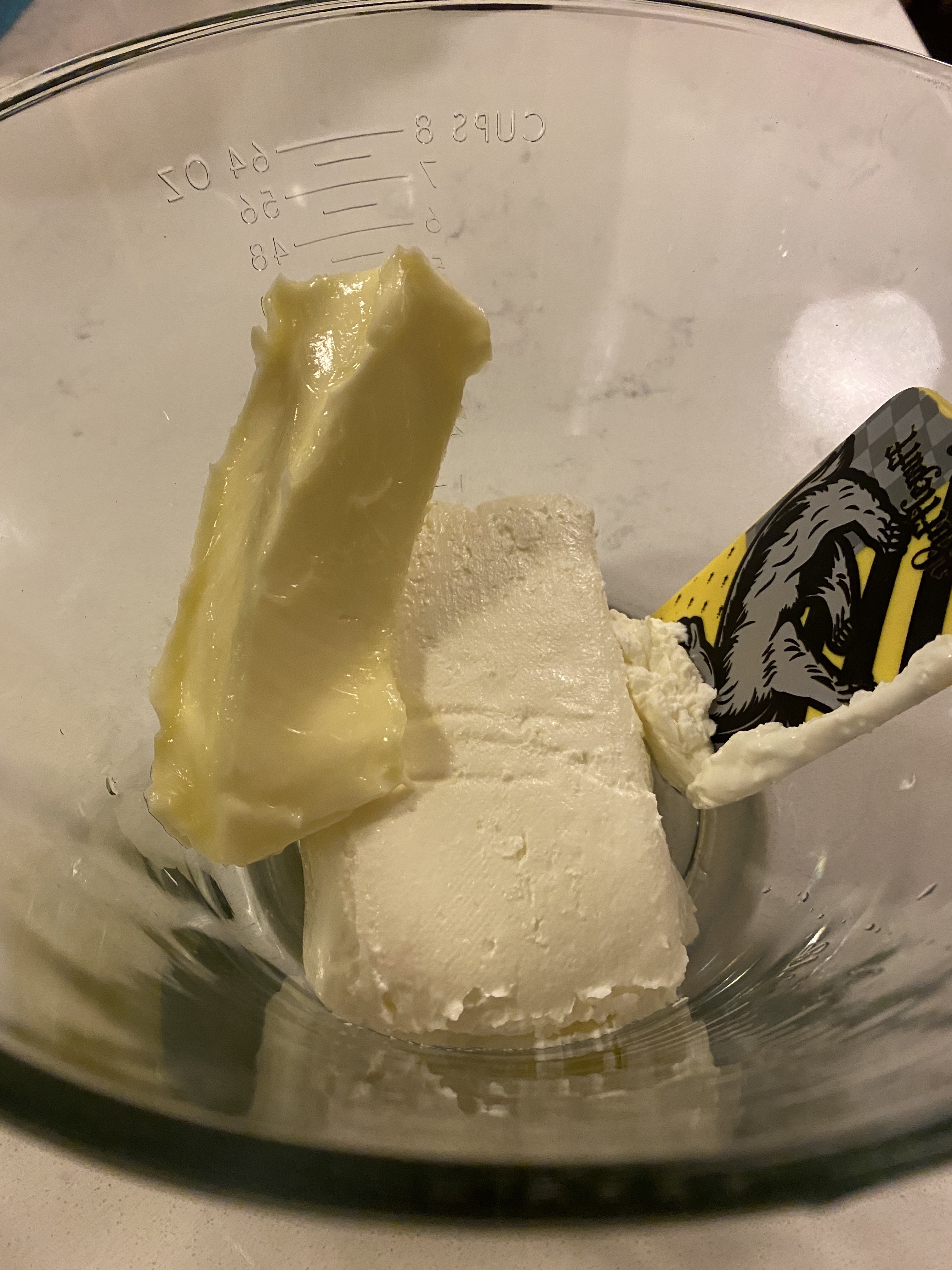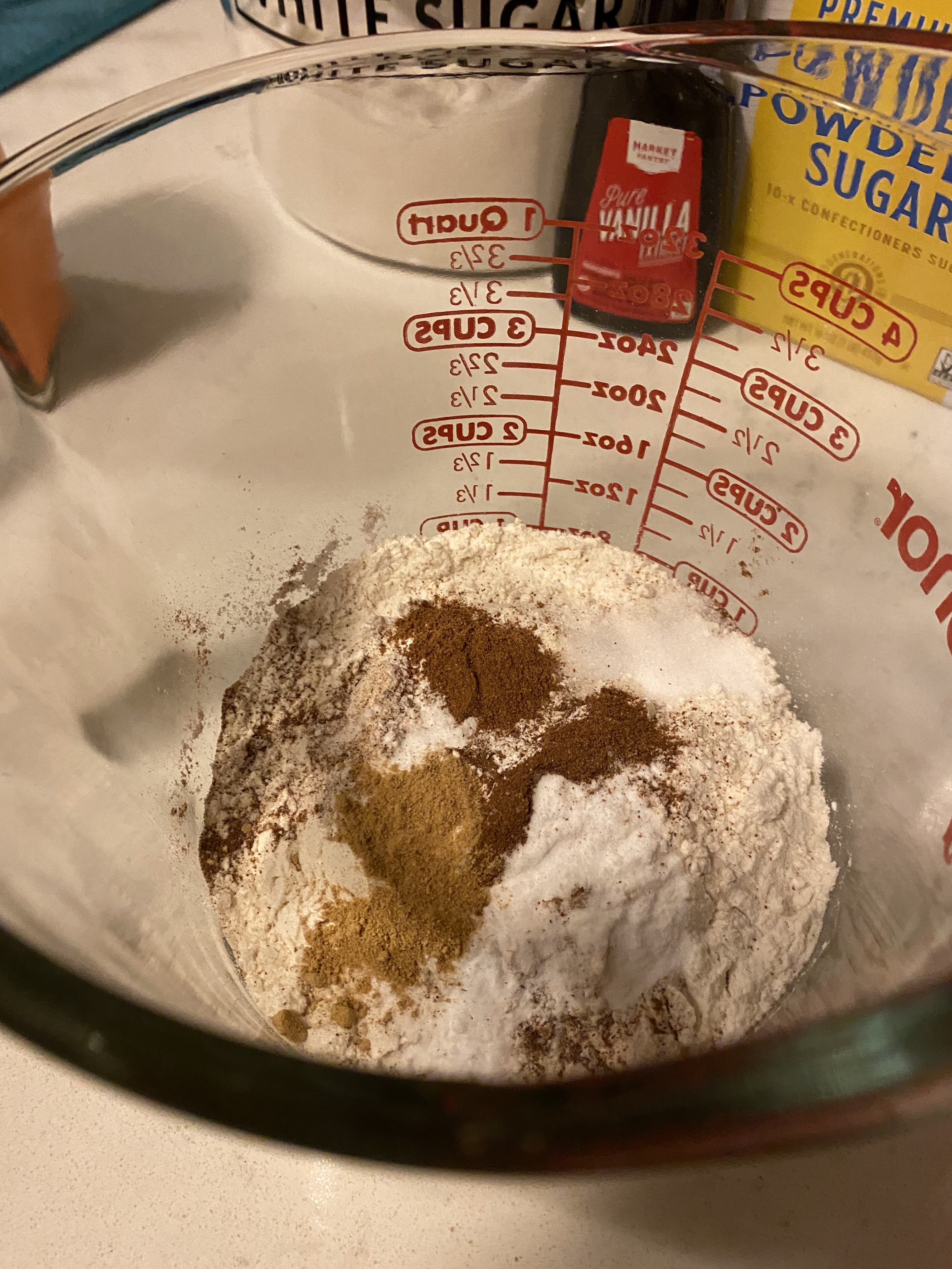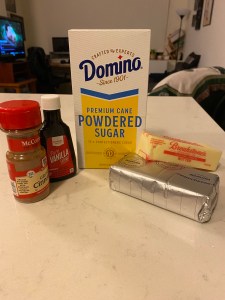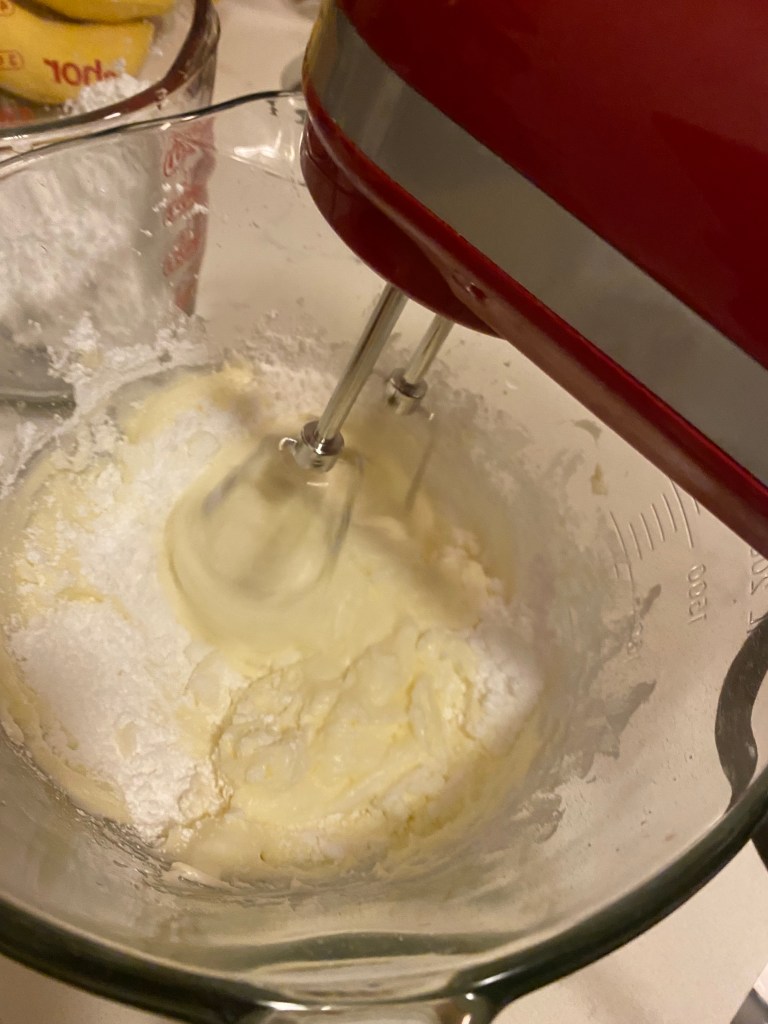 About an hour and a half later, I prepped the frosting. I first mixed the package of cream cheese with the butter until it was smooth and silky. Then, I added the cinnamon and vanilla. Finally, I put the confectioner’s sugar in the mixing bowl but I actually used about a half cup less than the recipe suggests because the frosting was sweet enough with just two cups.
