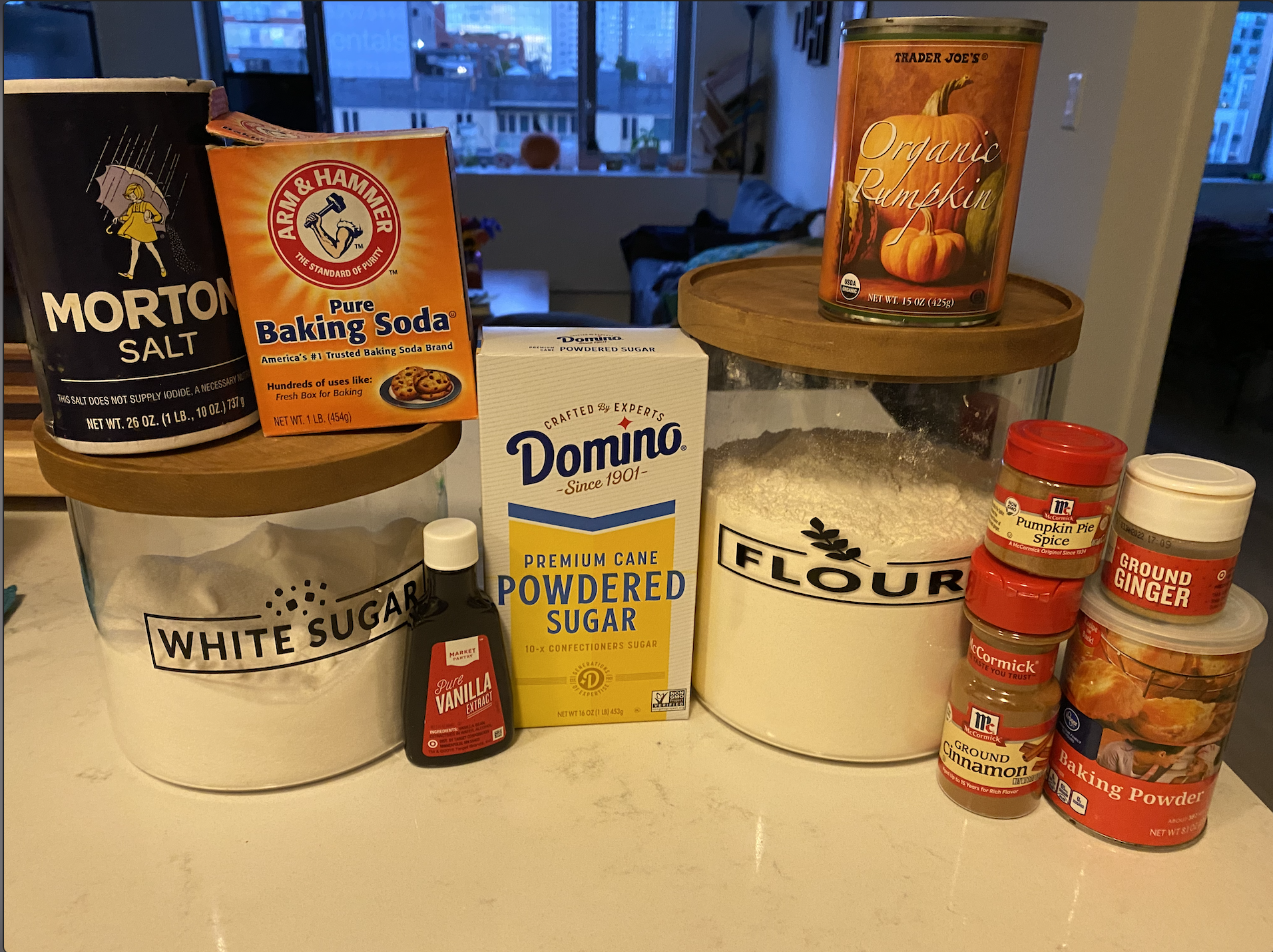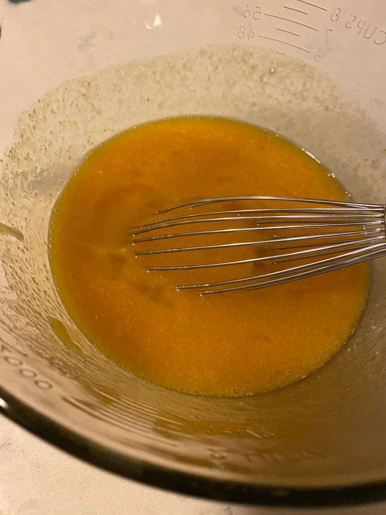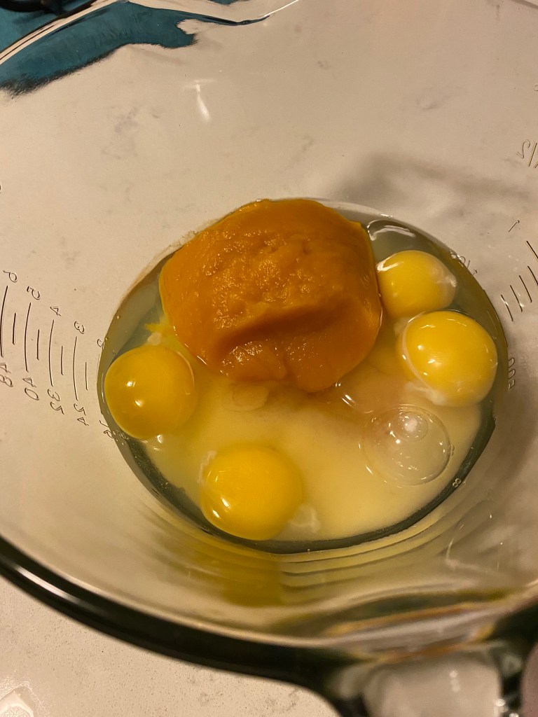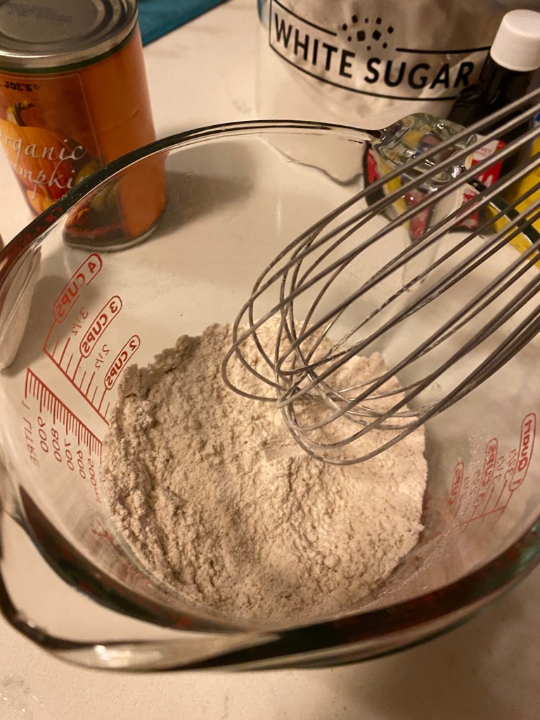 Then, I mixed all of the dry ingredients together in one bowl – so the flour, cinnamon, baking powder, baking soda, salt, all spice (I used my pumpkin spice), and ginger. Then, in a separate bowl, I mixed the sugar, pumpkin puree, eggs, and vanilla extract together. When the wet ingredients and sugar were well mixed, I added in the the dry until it was a smooth cake batter. The blend of the spices and pumpkin smelled exactly how fall should.