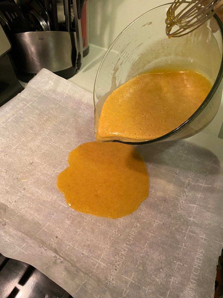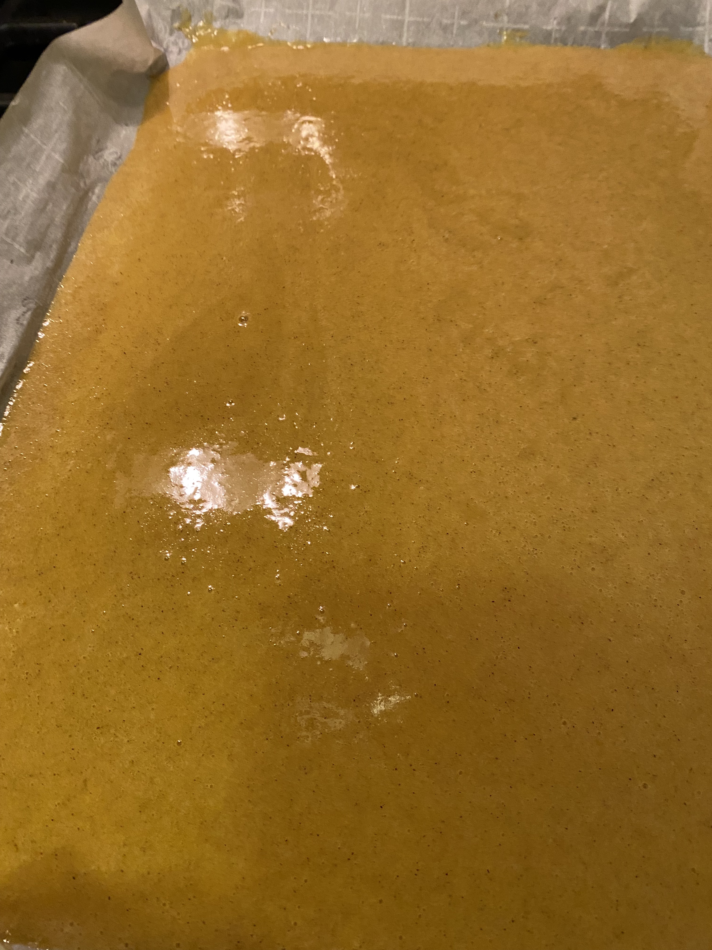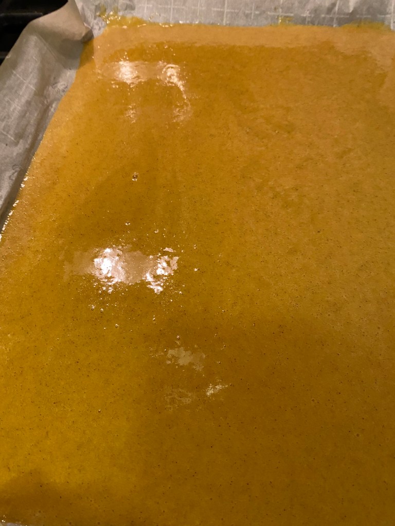 Once all the ingredients were together, I poured them into my prepared baking sheet. When I looked at the amount of batter as compared to the size of my baking sheet, I was surprised that I actually had enough. The mixture was such a thin layer along the bottom, but it did spread to all of the sides so it was actually perfect. The cake bakes for 14-15 minutes or until the cake bounces back when it is touched.