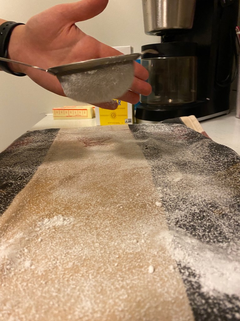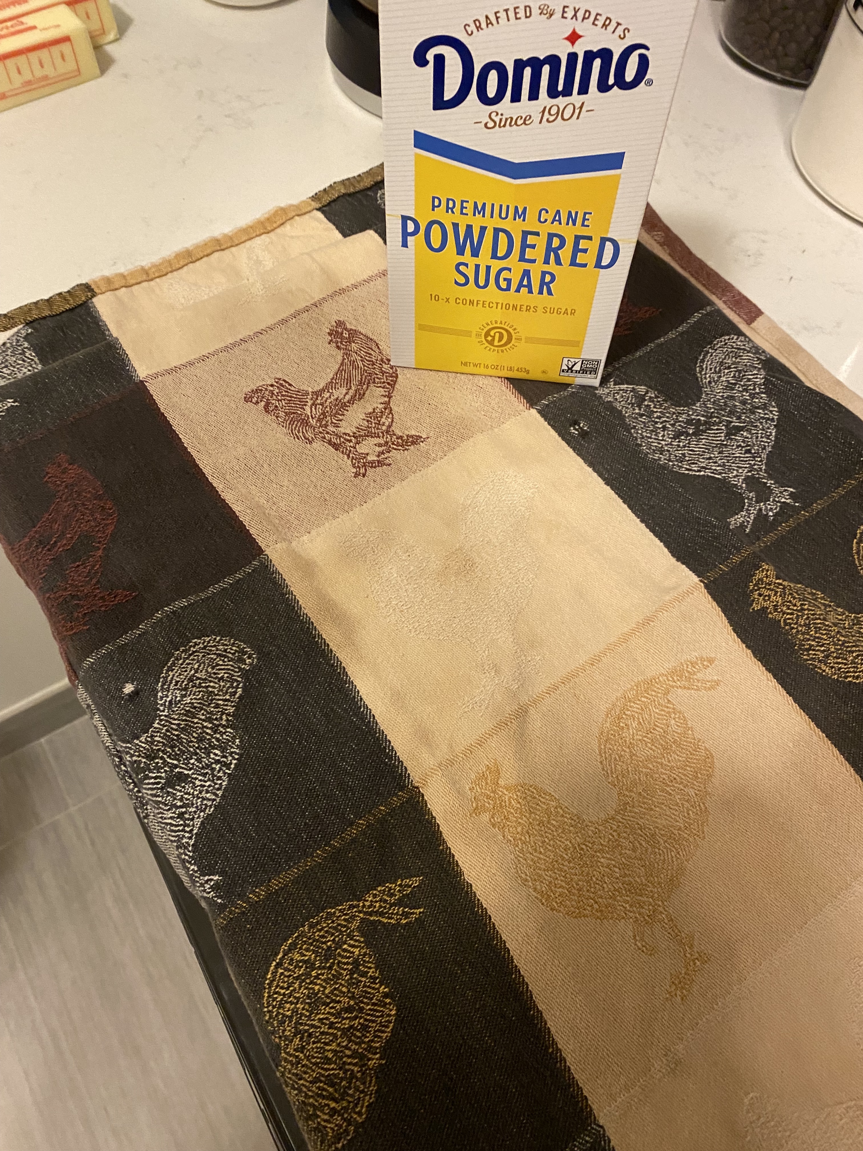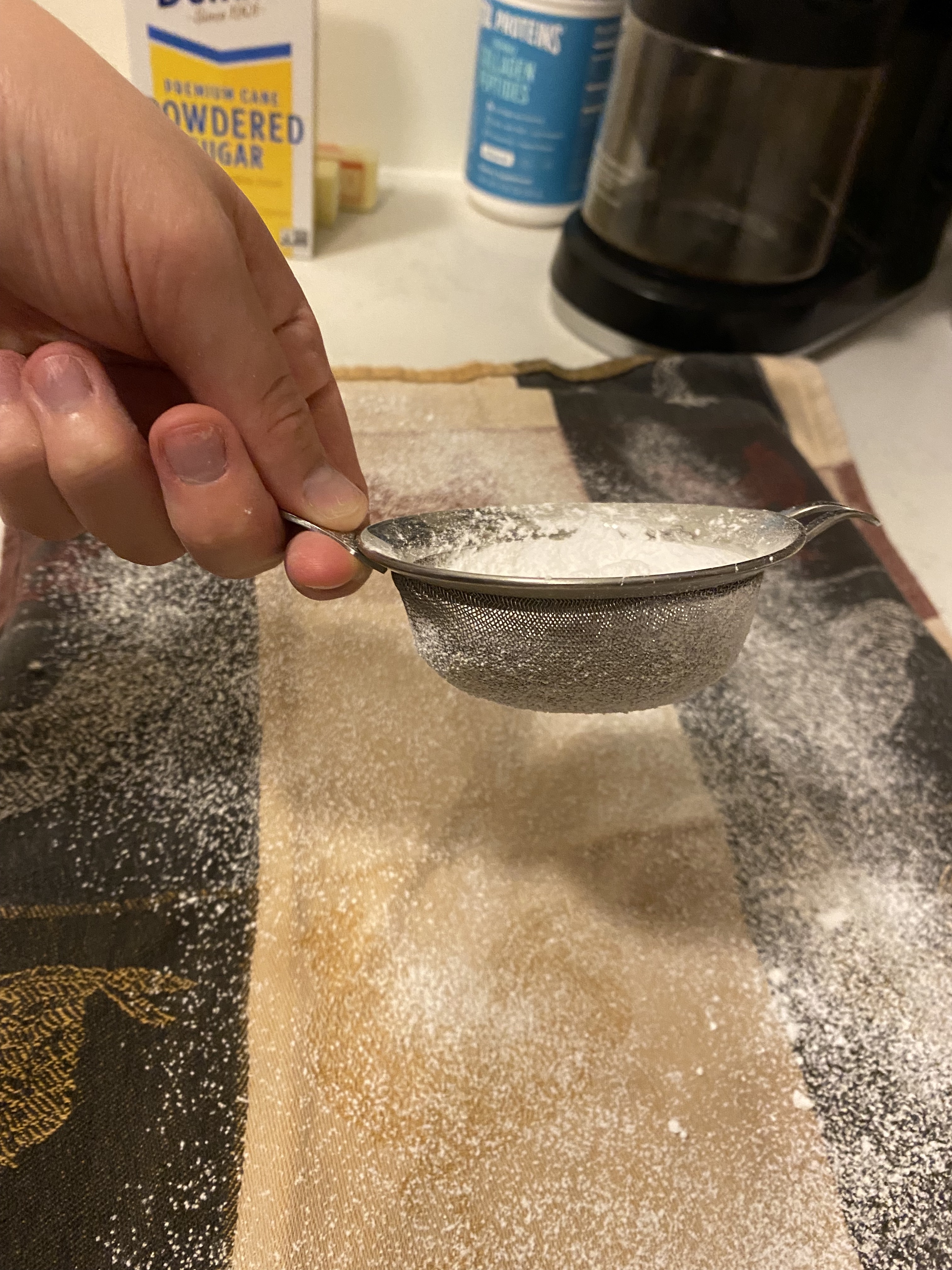 While the cake was baking, I prepared the area that I was going to roll the cake. I placed a clean kitchen towel over my cutting board and sprinkled a layer of confectionary sugar over it.
