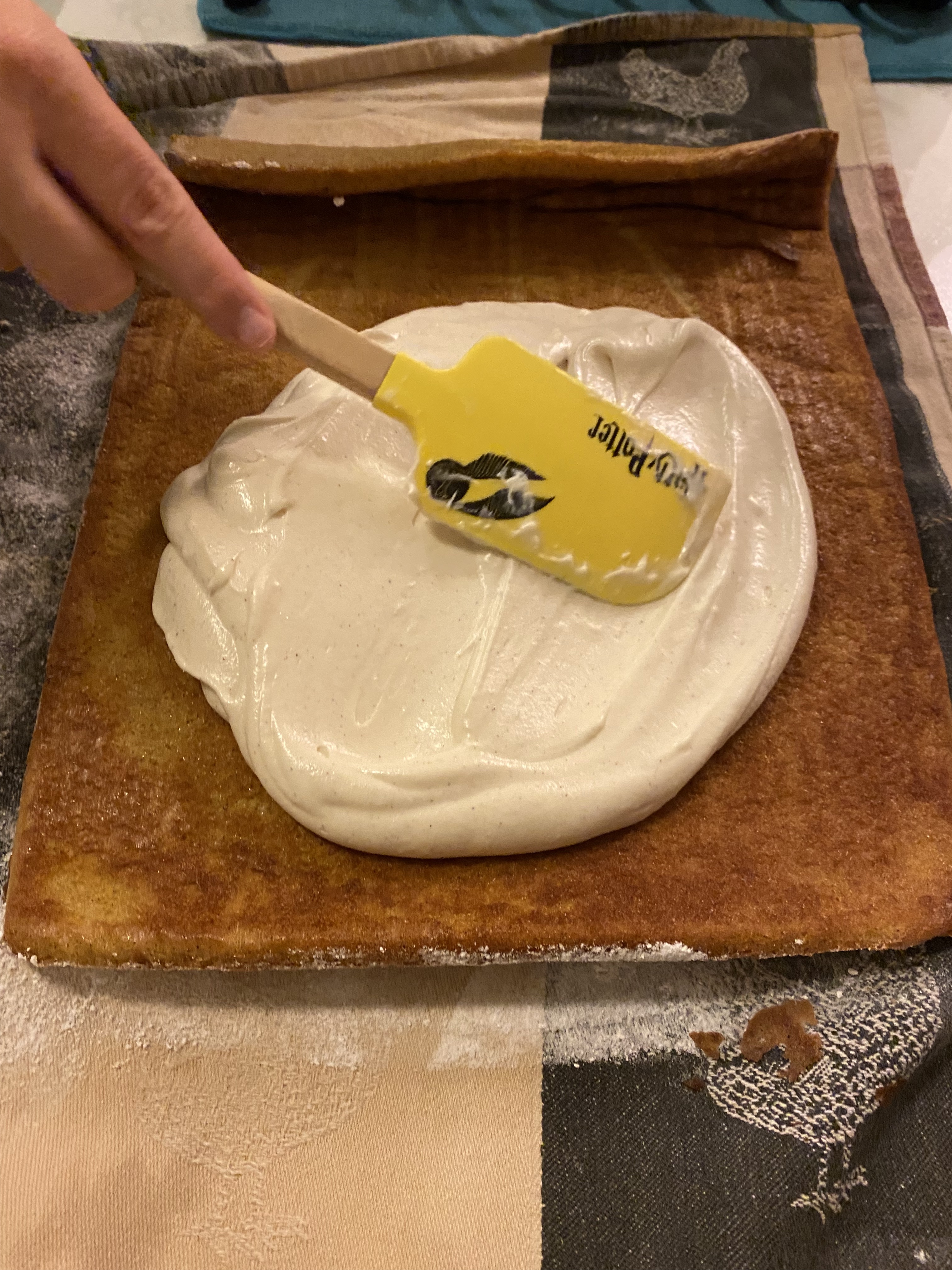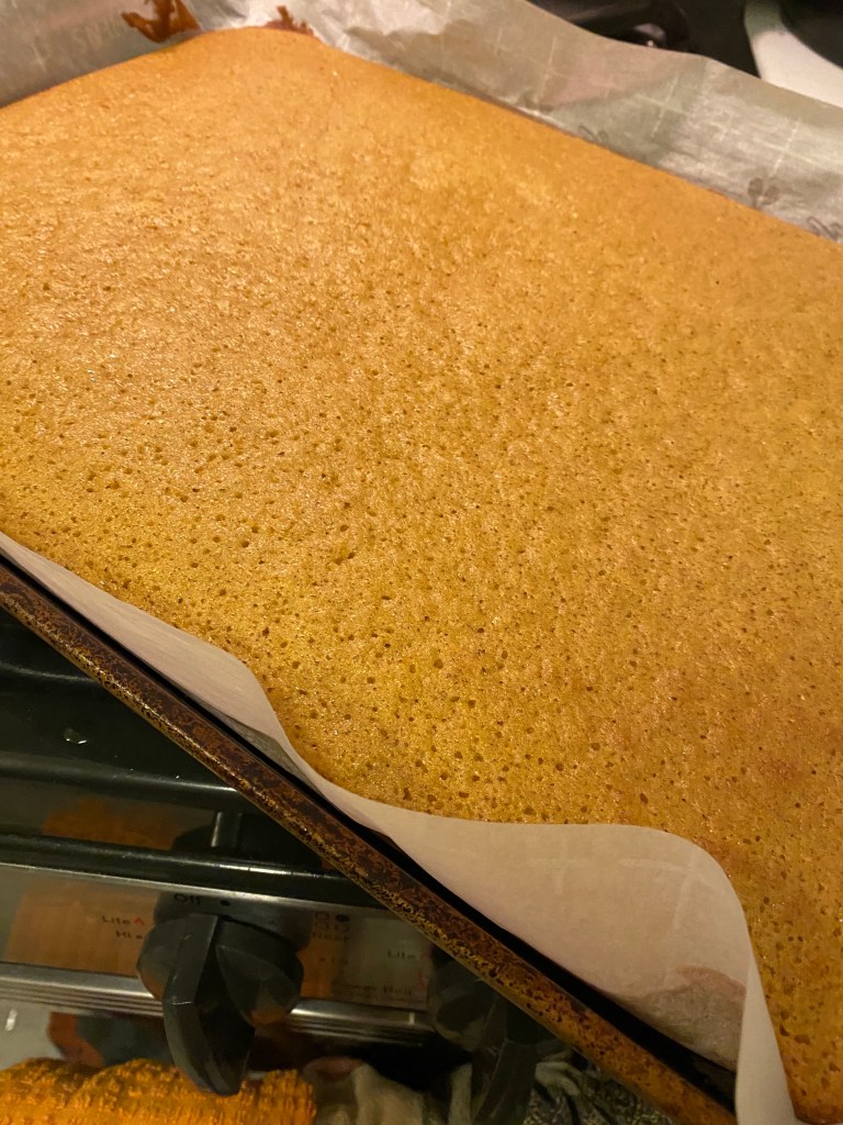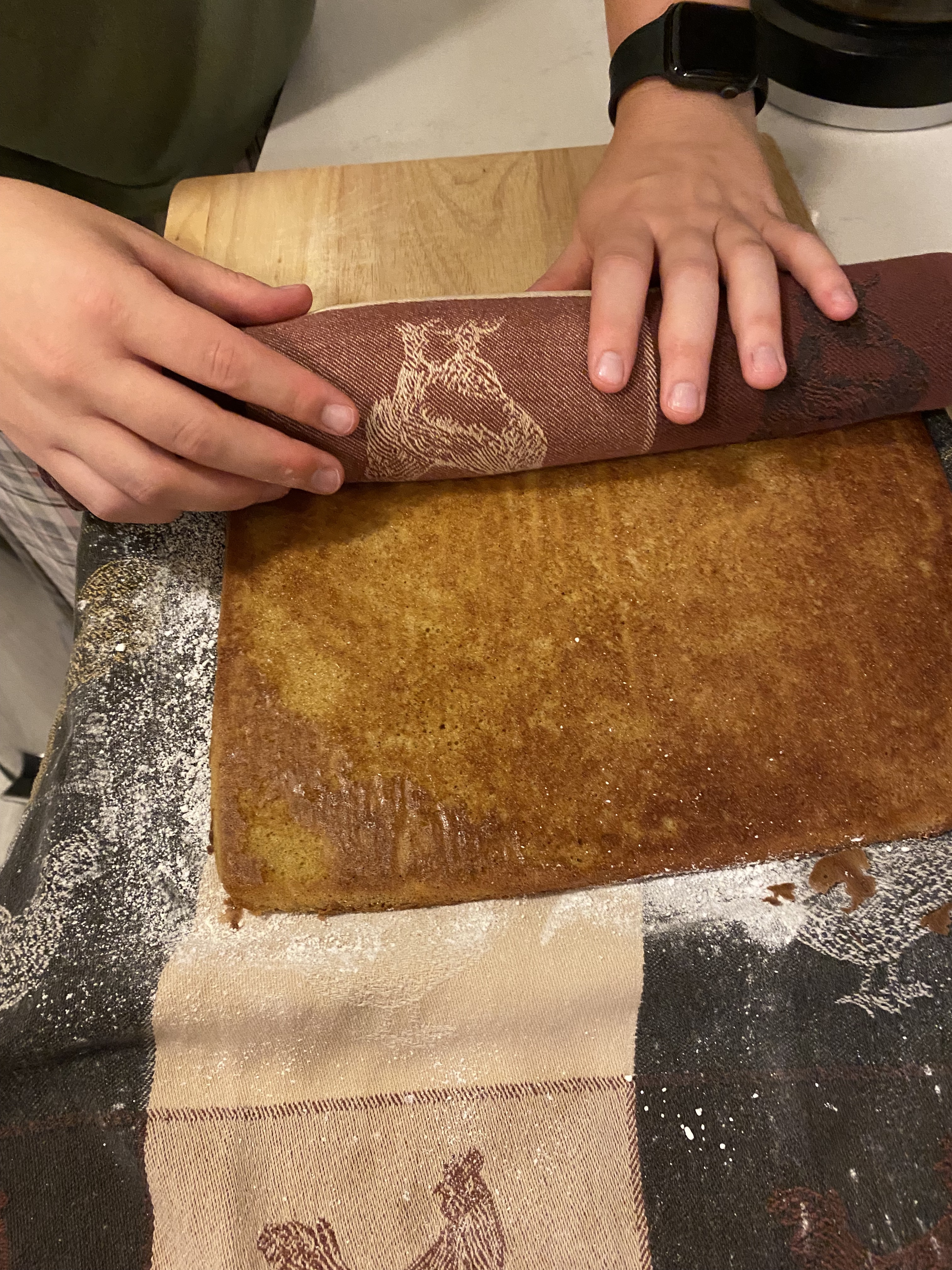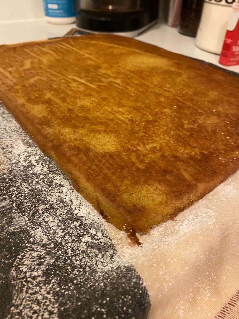 When the buzzer went off, I took the cake out and used a knife to scrape the edges of the cake loose from the edges of the pan. The most nerve-wracking portion of this bake was flipping the cake onto the towel. I didn’t want it to crack or break or fall to the floor. With Pete’s help and support, I quickly flipped the cake out of the sheet pan. The crucial part of this recipe was making sure to roll it up while it was hot. I slowly moved the short side of the cake towards the other side and then let it rest for two hours with the seam side down.