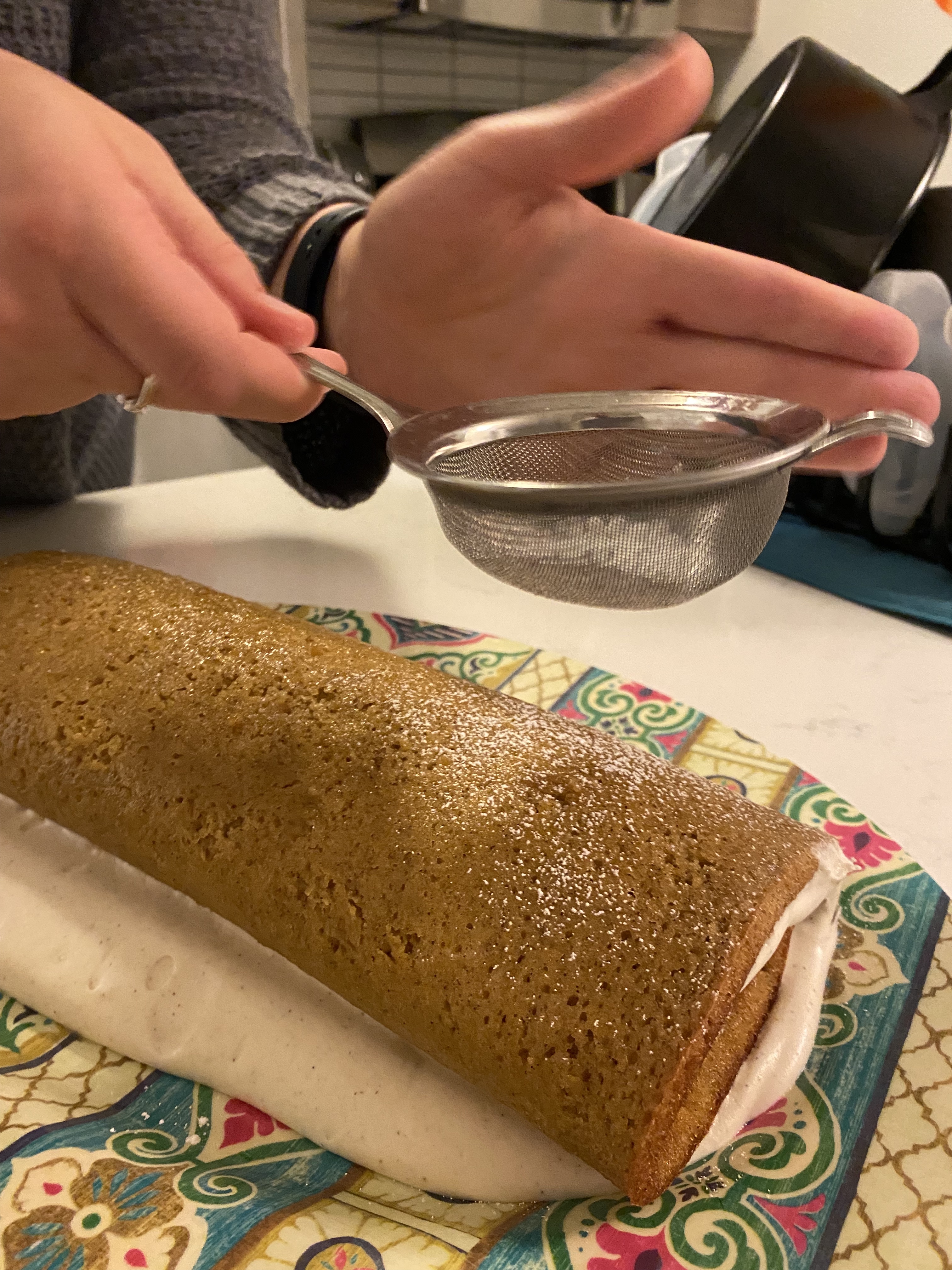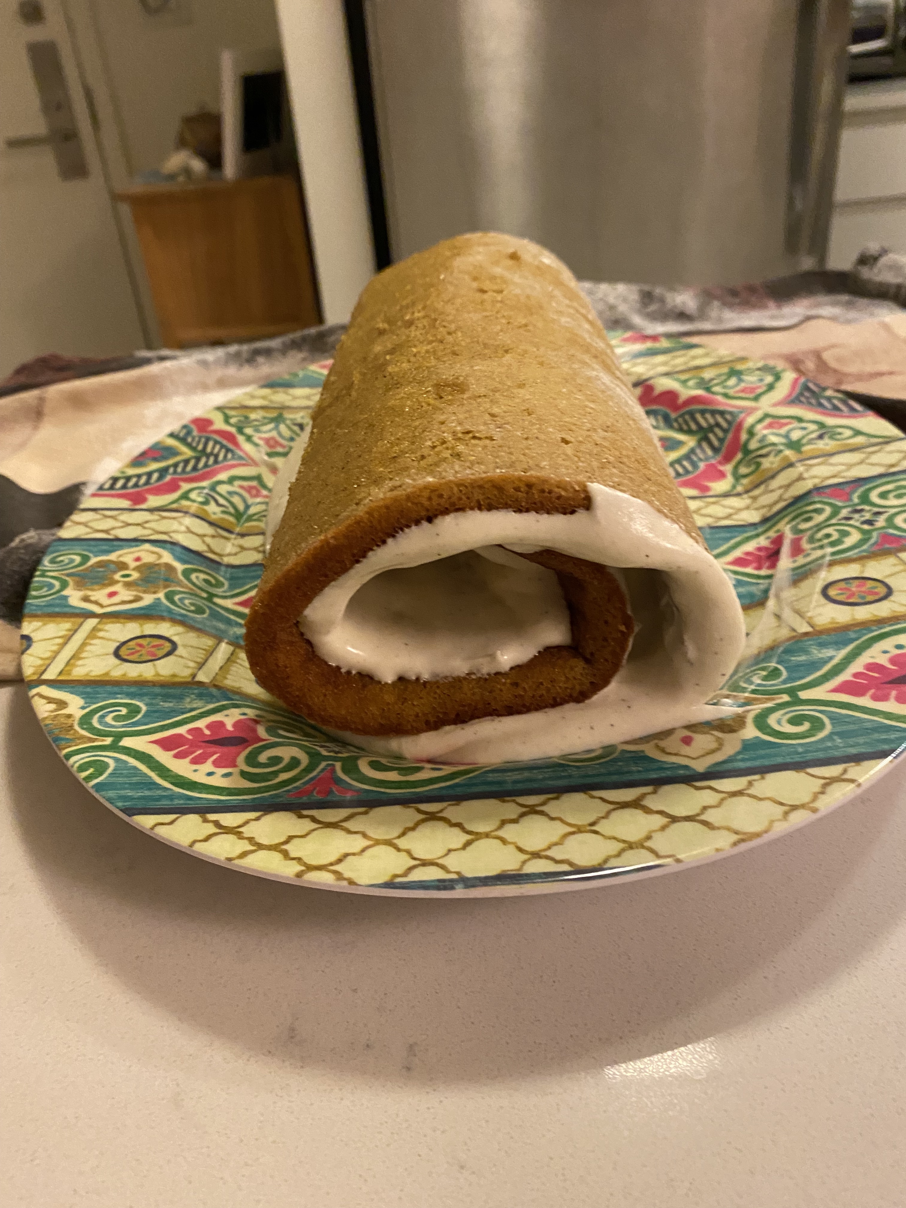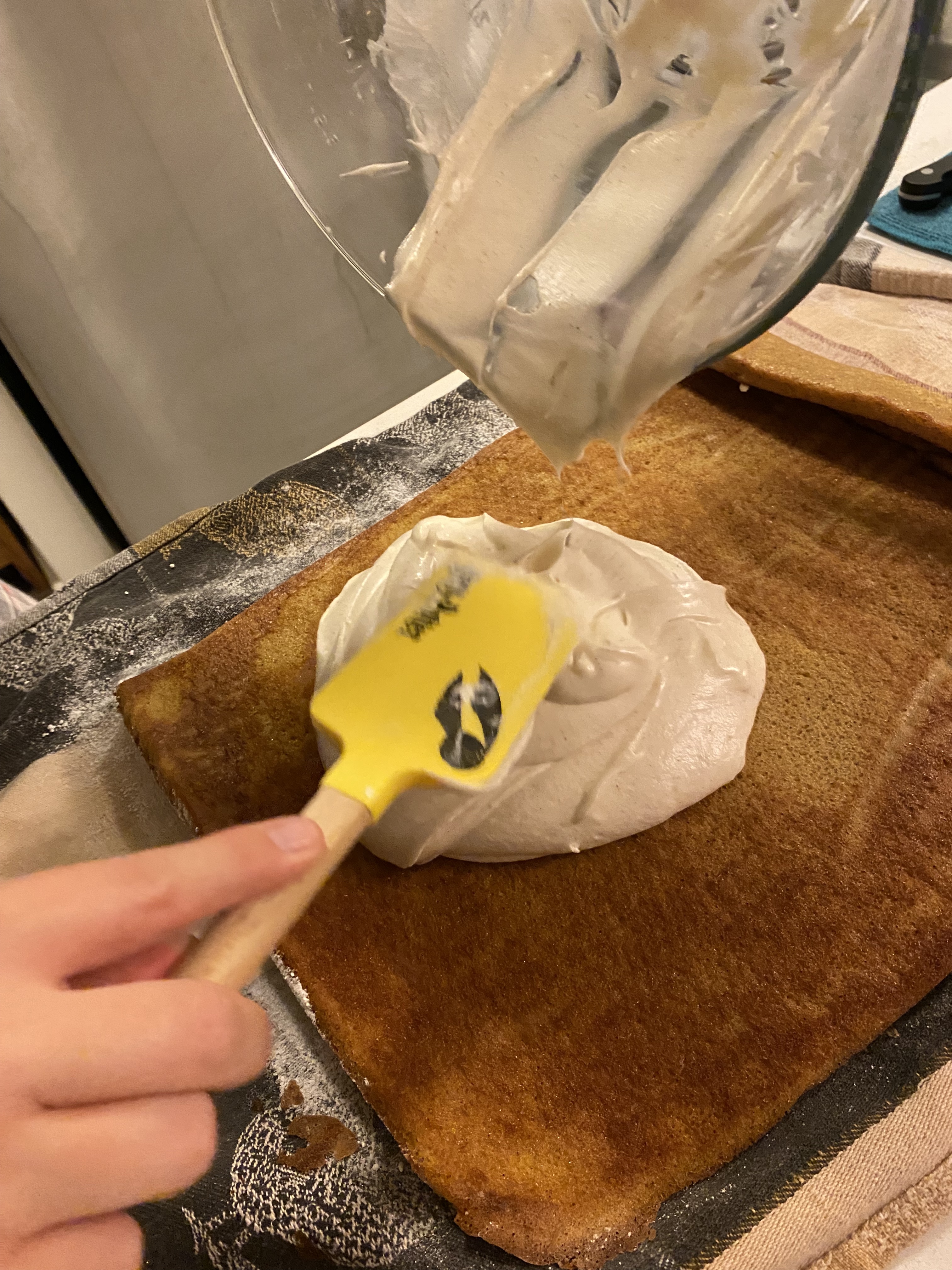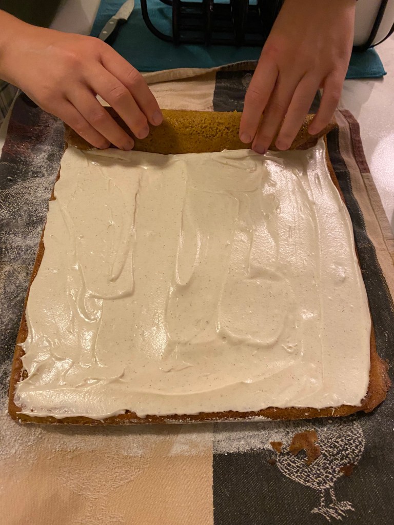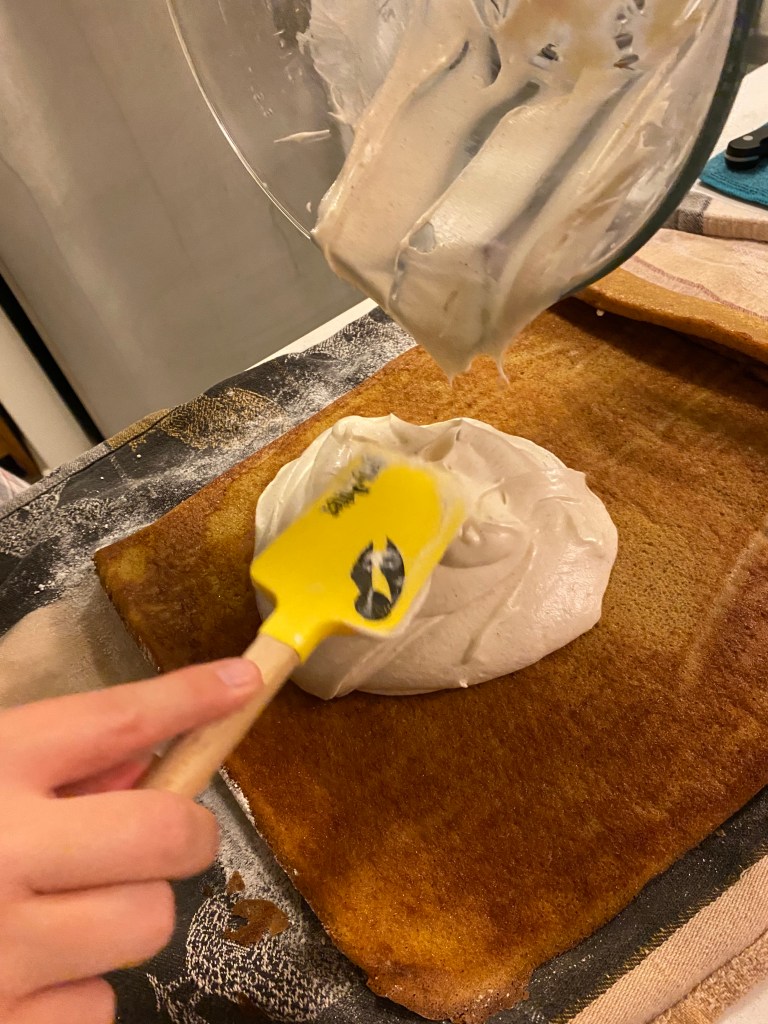 The frosting was ready right around the time when the cake was cooled down. I slowly unwrapped the towel and my cake did curl up quite nicely. With a spatula, I spread my frosting onto the cake evenly to all the corners. Then, I slowly rolled the cake with the frosting back into a cylindrical shape. A piece of advice I found out the hard way was to STOP spreading the filling a few inches from the edge. If you don’t, then when you roll the cake back up the frosting will ooze out all over your platter. Thankfully the frosting was so tasty that we couldn’t waste it. As you can see in the photo, we left it that way. Once the cake was all rolled up, I covered it in plastic wrap and it set over night.
