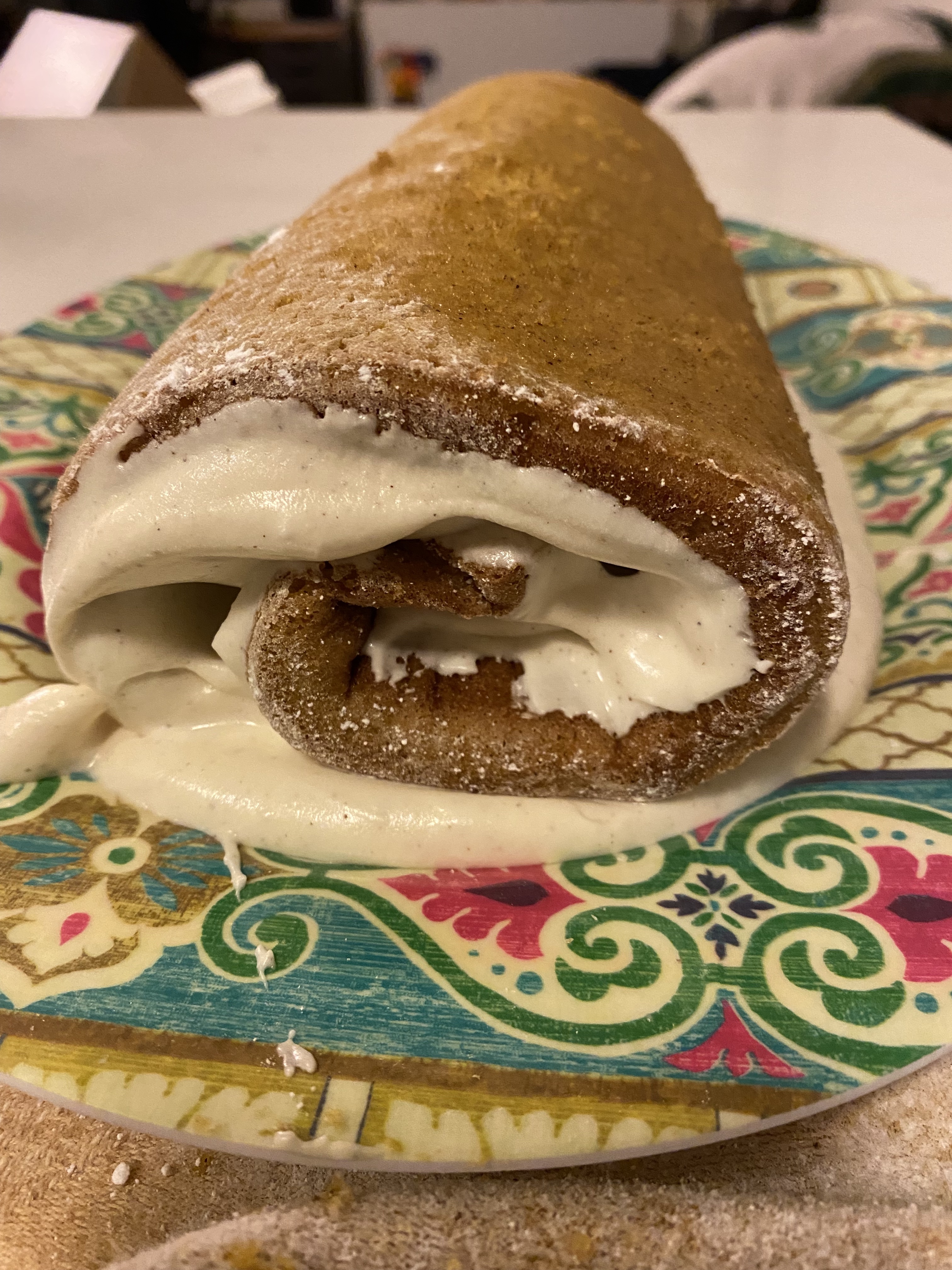 Today’s baking blog has been one I’ve been excited to share for weeks. I’ve made a lot of tasty treats this past year but nothing has been as perfectly balanced flavor wise as the Pumpkin Roll I made from The Pioneer Woman’s recipe. The cake has a delicate pumpkin flavor that matches so well with the cinnamon cream cheese icing that is spread in side. Read on to find out the steps! I was surprised by how easy this recipe was. I really thought I would get so many cracks in the cake.