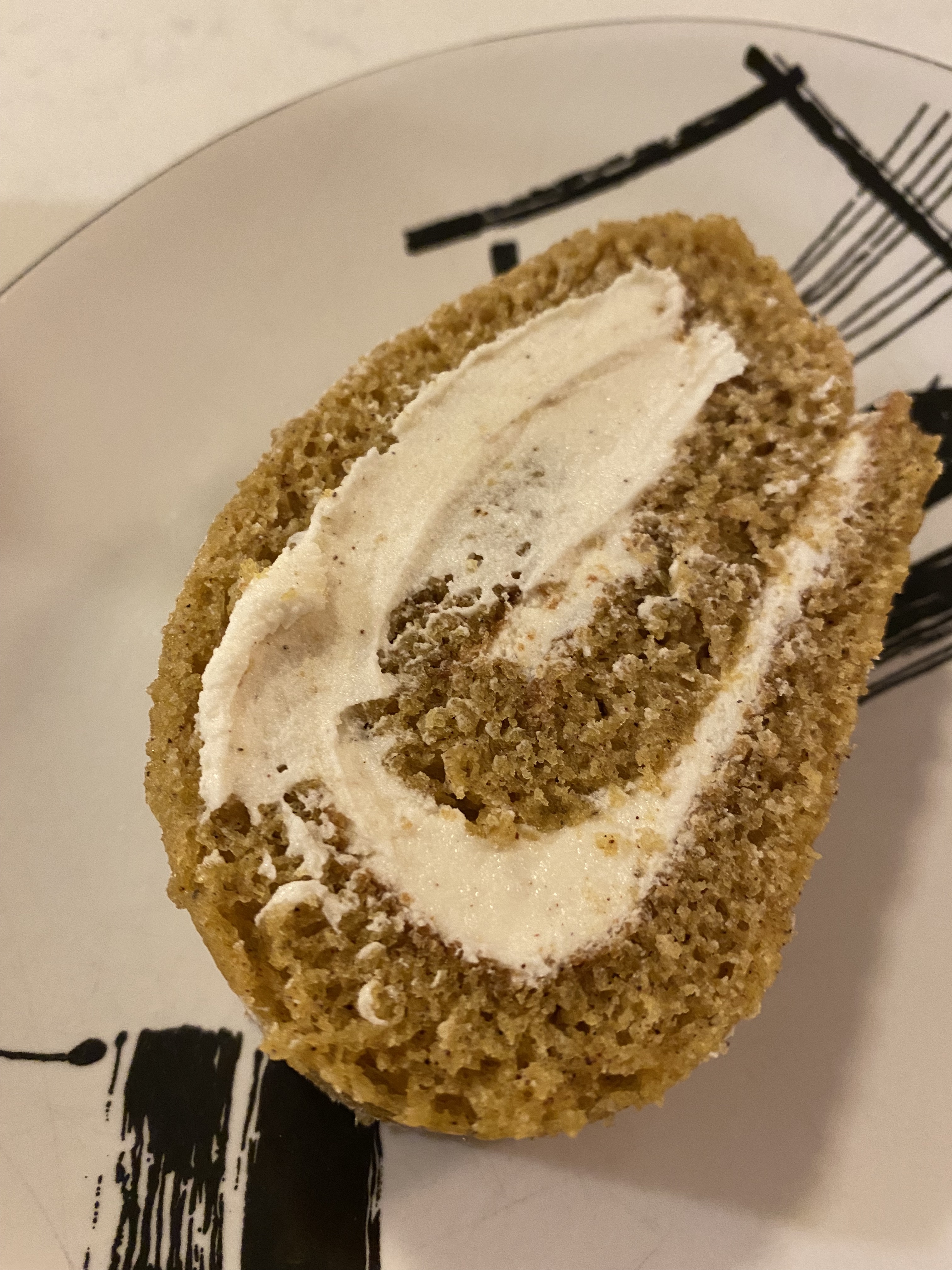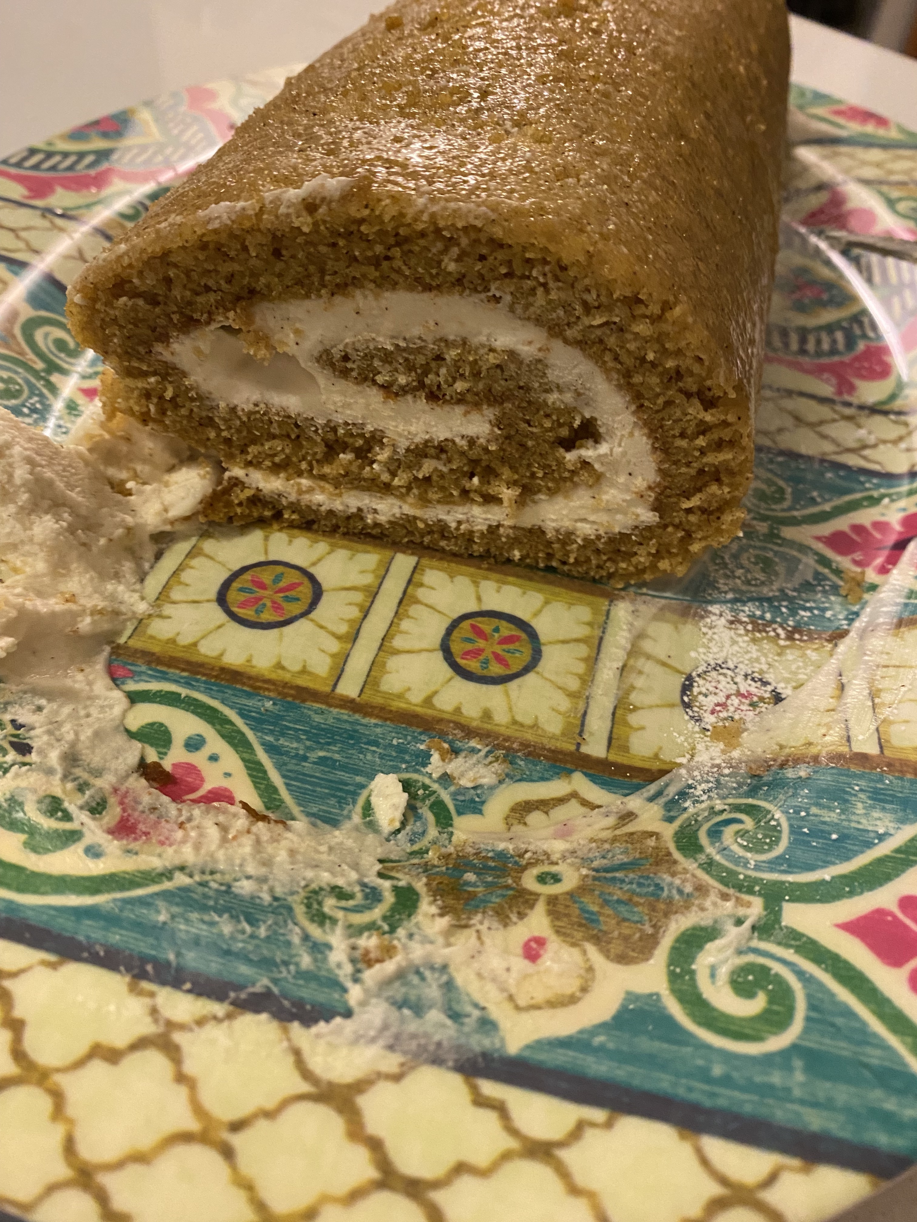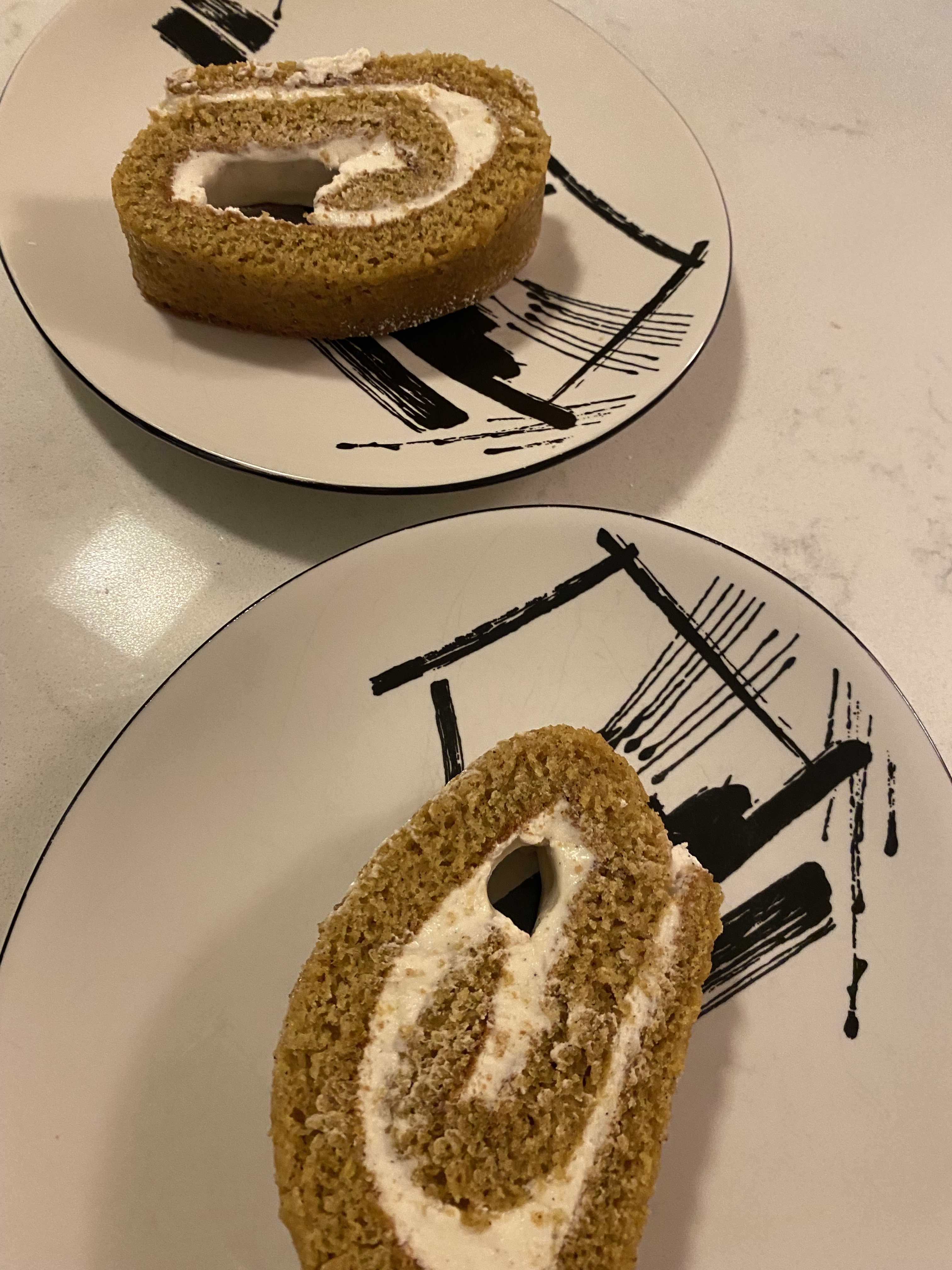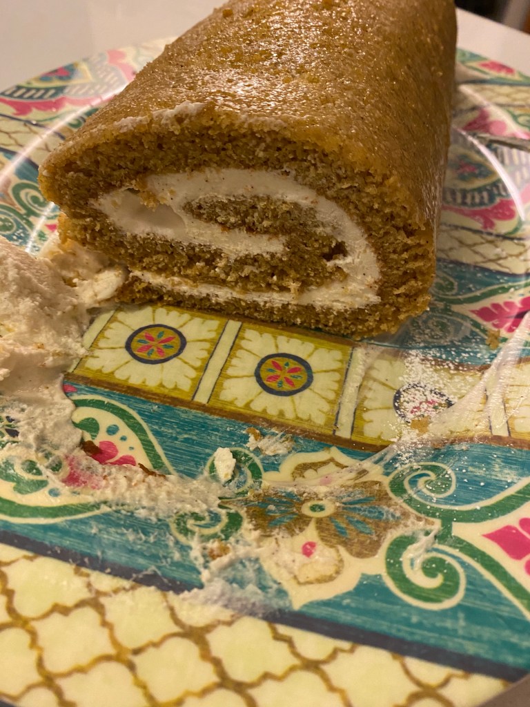 The next day, I dusted the top of the cake with confectioner’s sugar and Pete and I enjoyed a slice of the cake after we finished our dinner. I’m normally more of a chocolate dessert fan but I absolutely loved the flavor of the pumpkin roll. Pete liked it so much he gave it a score of 9.9 and gave me his own version of the Hollywood handshake a la The Great British Bake Off. I see this recipe being repeated each fall for a long time.