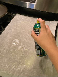 The first step involved preheating my oven to 375 degrees and preparing my baking sheet by lining it with parchment paper and spraying with cooking spray. Once that was done, I placed it to the side.