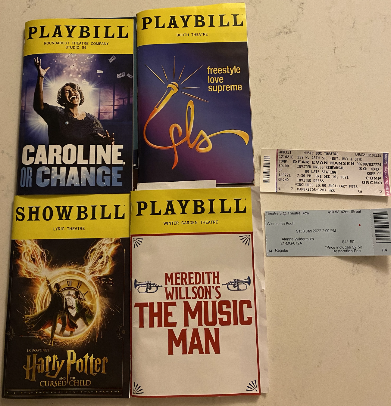THEATER – I have been lucky enough to have seen several plays since the theaters have opened up for the vaccinated. I can’t choose one as my favorite since I’m just so grateful to see live performances again – I didn’t get playbills from Shakespeare in the Park, Dear Evan Hansen, or the Winnie the Pooh Play so the tickets will have to do:
