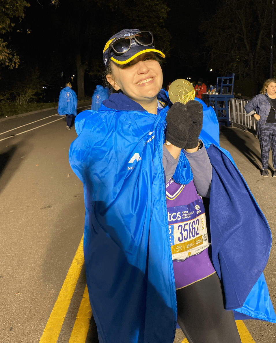 I FINISHED THE NYC MARATHON!!! November 7th, 2021 was an incredibly tough and painful day but it was so amazing to cross the finish line. Even though it was my second time running this race, it still felt special from start to finish. From training in Central Park and the NY streets to seeing Pete in his red medical team jacket at the finish line, I felt lucky to be running. I was grateful for all the people cheering along the sidelines – especially my friends who let me give them sweaty hugs, listened as I cried, ran with me, and held encouraging signs. At this point, I remember the intense soreness I felt the day after the race so I don’t foresee myself running this marathon again, but I also think about the amazing crowds throughout all five boroughs and it ALMOST convinces me it would be fun…but just almost.