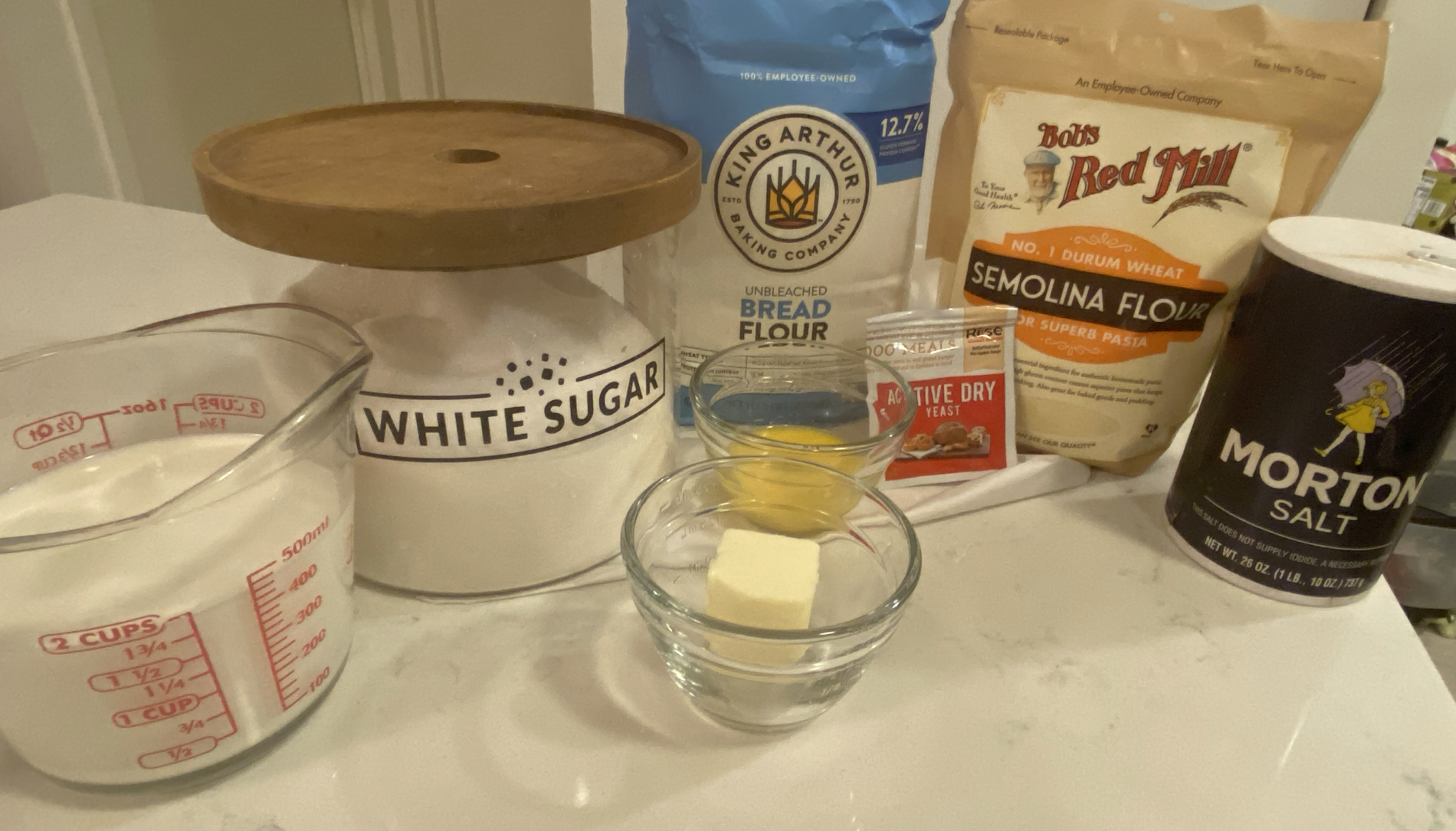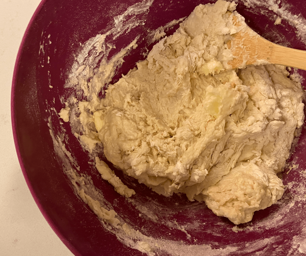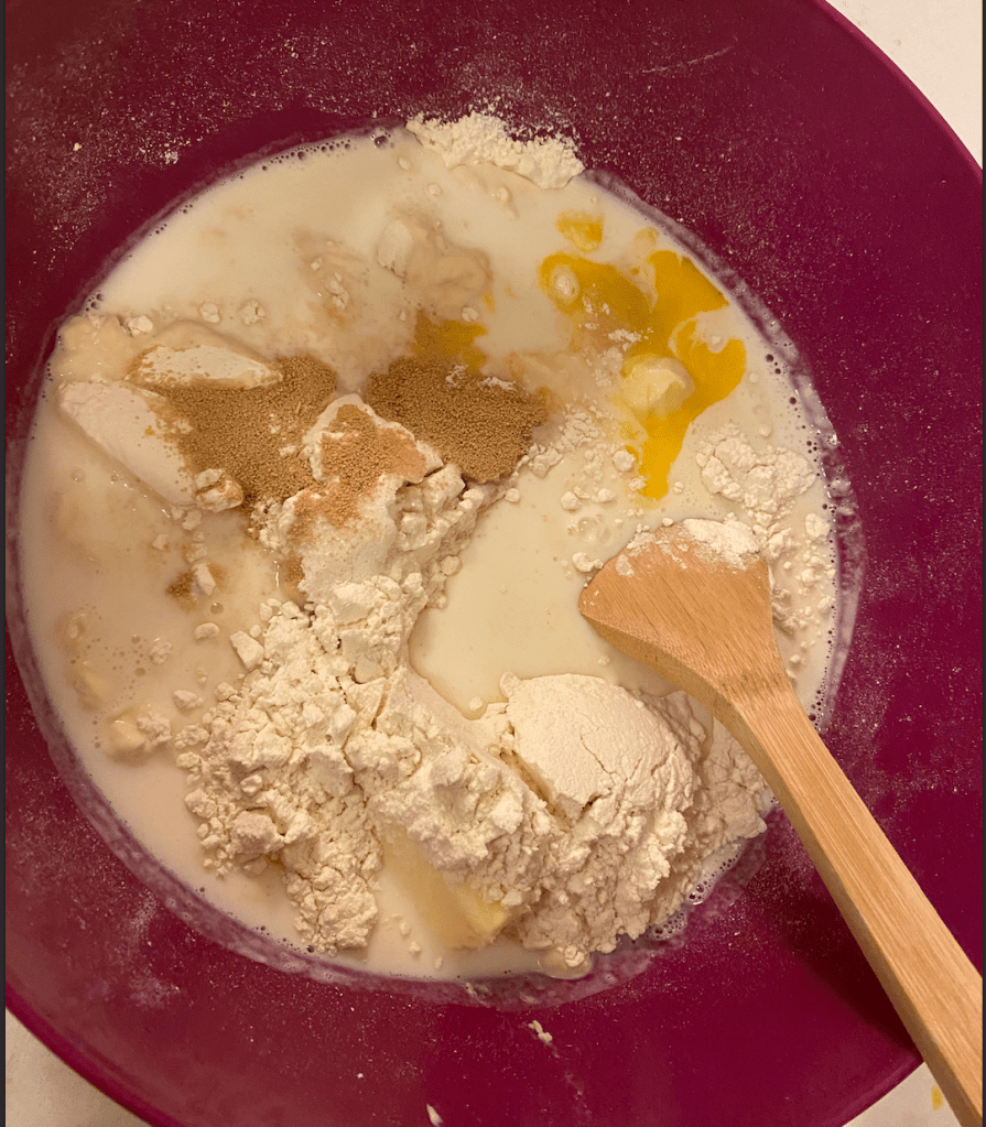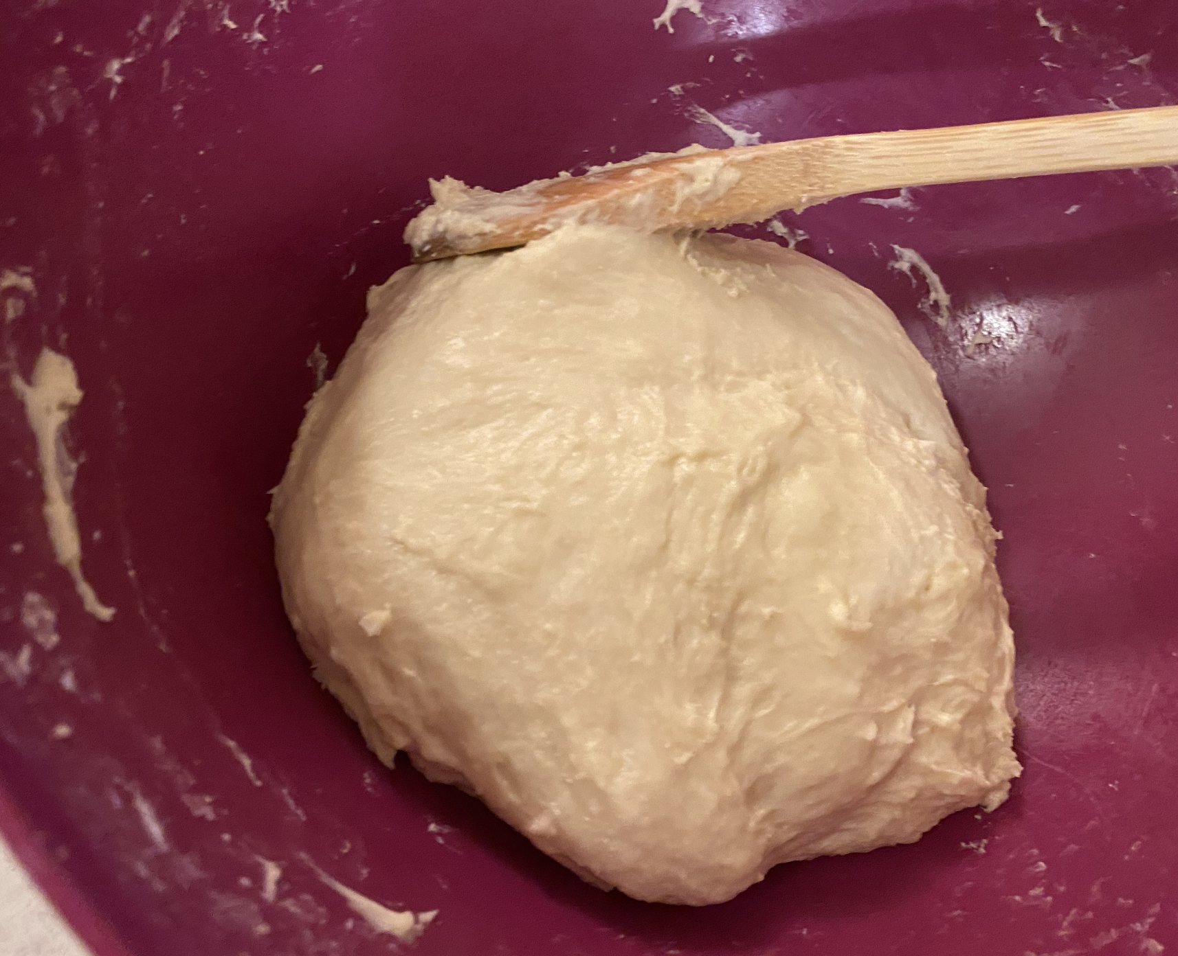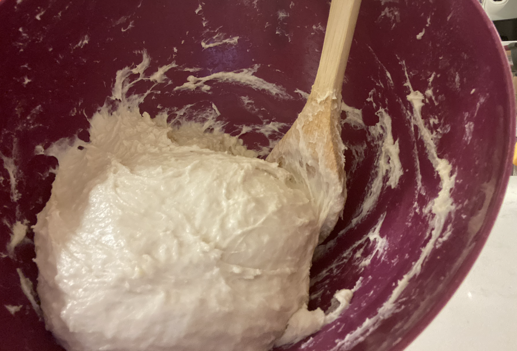 The first step to making the English muffins was pretty easy and involved weighing out 540 grams of flour (I used my scale thanks to my friend Meredith!). Then, I added the rest of the ingredients except for the Semolina flour to the mixing bowl. As I said before, I don’t have a stand mixer or a bread machine (I just have a hand mixer), so I had to mix the ingredients together with a large wooden spoon. The recipe warned that it would take some muscle and time, and thankfully I have been lifting weights so it wasn’t too bad (although I did feel my arms later lol!!)