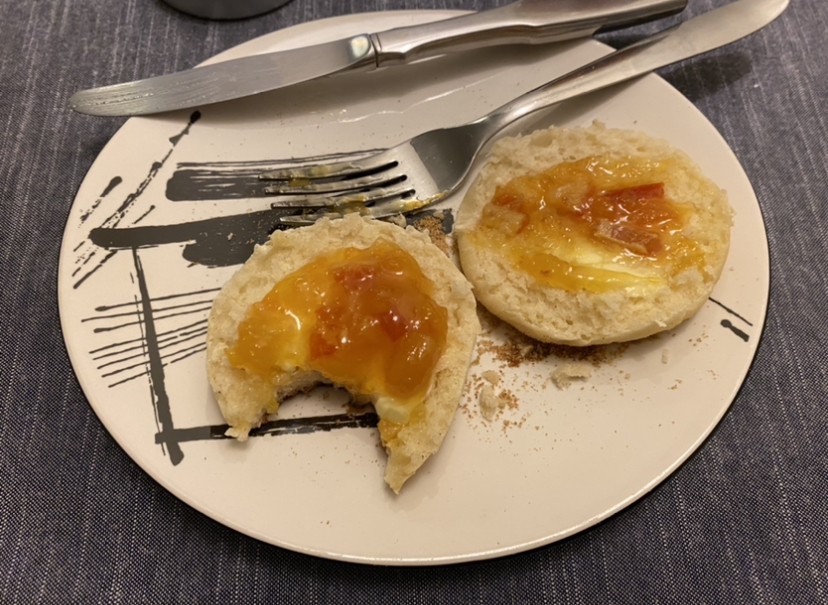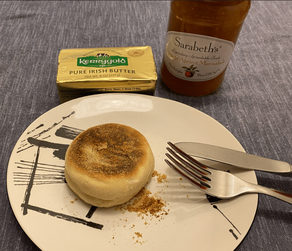 Once the first batch of muffins were cooled, I had to dig in. Using a fork instead of a knife to keep the nooks and crannies in place, I cut the English muffin open to reveal a beautifully baked/cooked center. I bought some nice Kerrygold Irish salted butter and Sarabeth Orange Apricot Spread and smeared a nice layer of both onto the bread. I was so excited and relieved to taste the traditional flavors of an English muffin that had the right texture and consistency that I was hoping it would have.