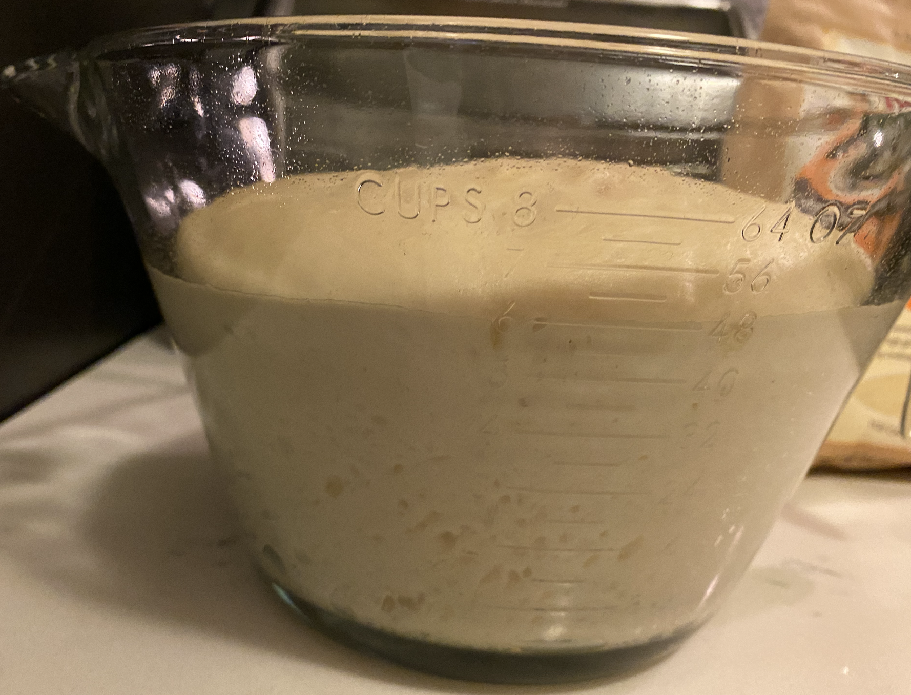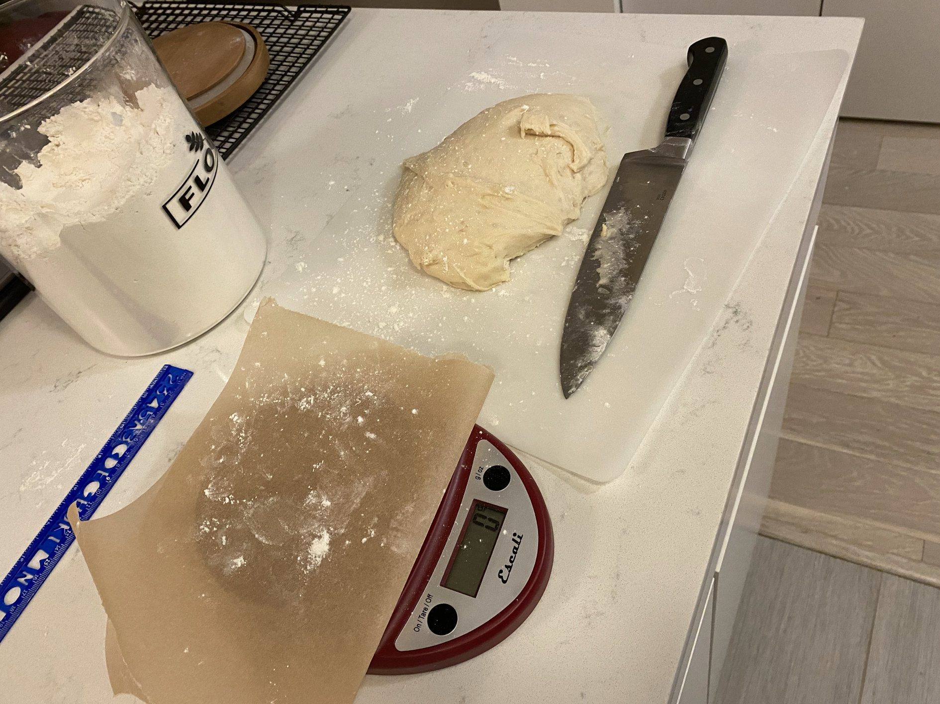 Once the dough came together and looked satin-y smooth, I shaped it into a ball and placed it in a clear glass bowl to proof until it had puffed up nicely. It took about two hours to get it to be about double it’s original size.