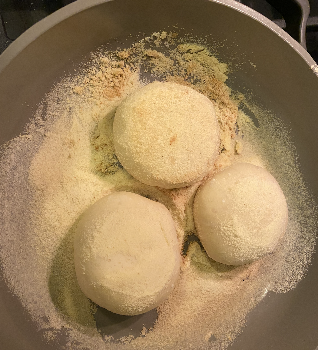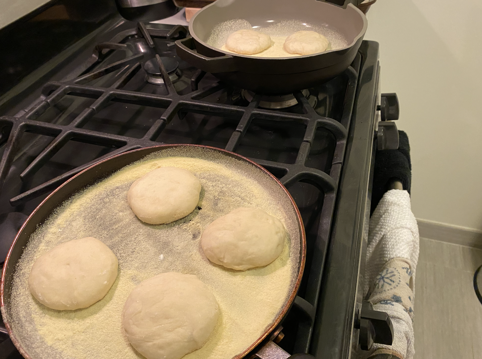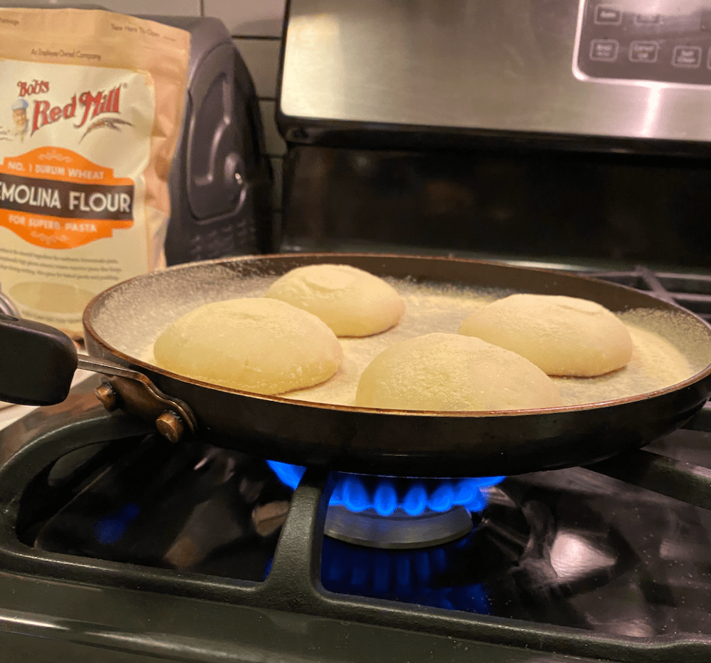 While the dough was proofing, I prepared the pans I was going to use to cook the English muffins. Since I was using pans that were not already seasoned, I sprayed two pans with cooking oil and sprinkled a somewhat thick layer of Semolina flour across the surfaces.