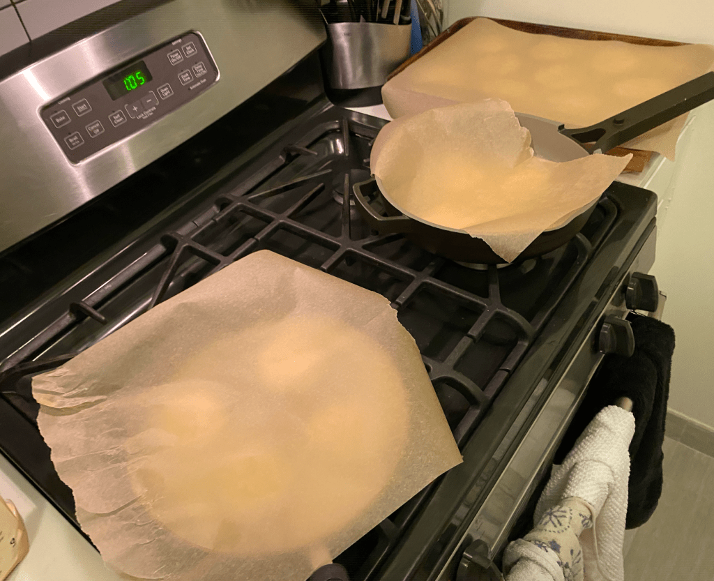 Once the dough was beautifully risen, I deflated the dough with my fingers and dumped it out onto a cutting board so I could divide the dough into sixteen sections. I weighed it out to find that each piece should be about sixty-four to sixty-five grams. I rolled each one into a ball and then pressed them down into a disc that was about three inches or so in diameter across. I laid four of the dough pieces into one pan, three pieces into the other, and placed the rest of dough onto a baking sheet that had a layer of Semolina flour on it. Then, both pans and the baking sheet were covered with a piece of parchment paper and rested for 20 mins to allow for the dough to puff a little bit.