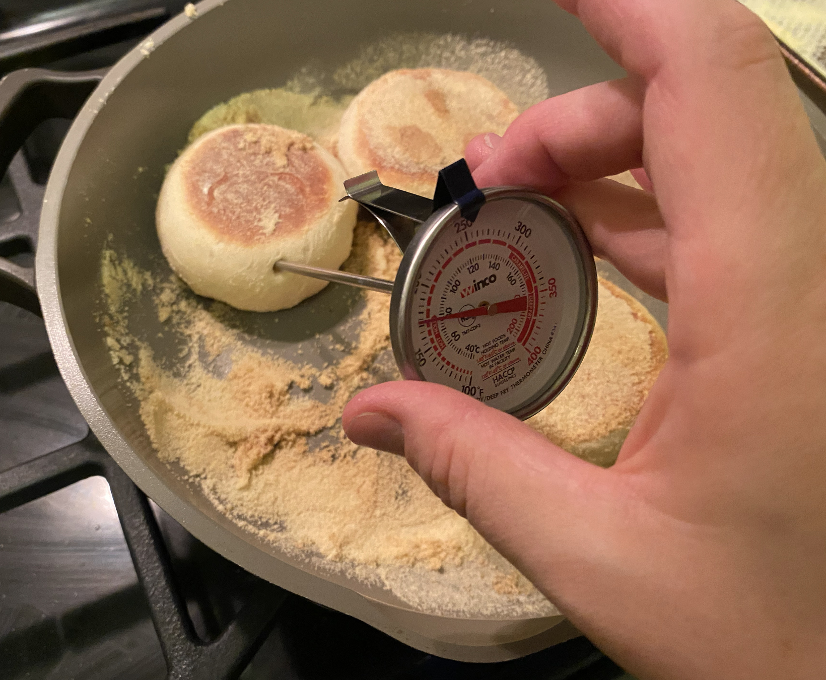 After the dough rested for a bit, I turned on the stove to medium-low and cooked the muffins for about 10 minutes per side until they started to expand a bit and each side was a nice golden brown. It was an interesting process because it kind of felt as though I was making pancakes. I was prepared to have to cook the muffins longer in the oven but when I stuck my thermometer into the centers of each muffin, it read to be at or close to 200 degrees. I placed the first batch on the cooling racks and then repeated the process until all 16 circles of dough were cooked through. It took a long time to finish all of them but I will say it was totally worth it.
