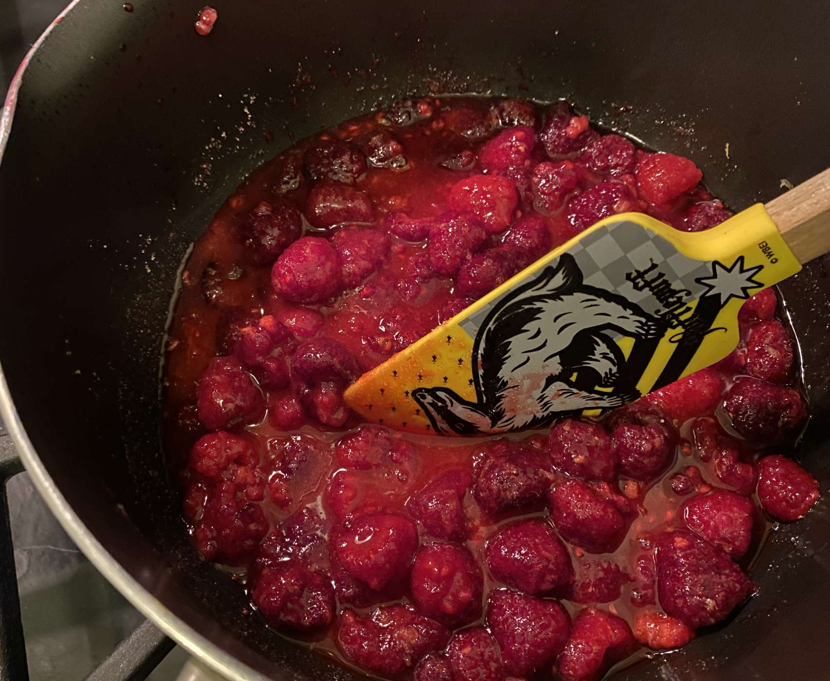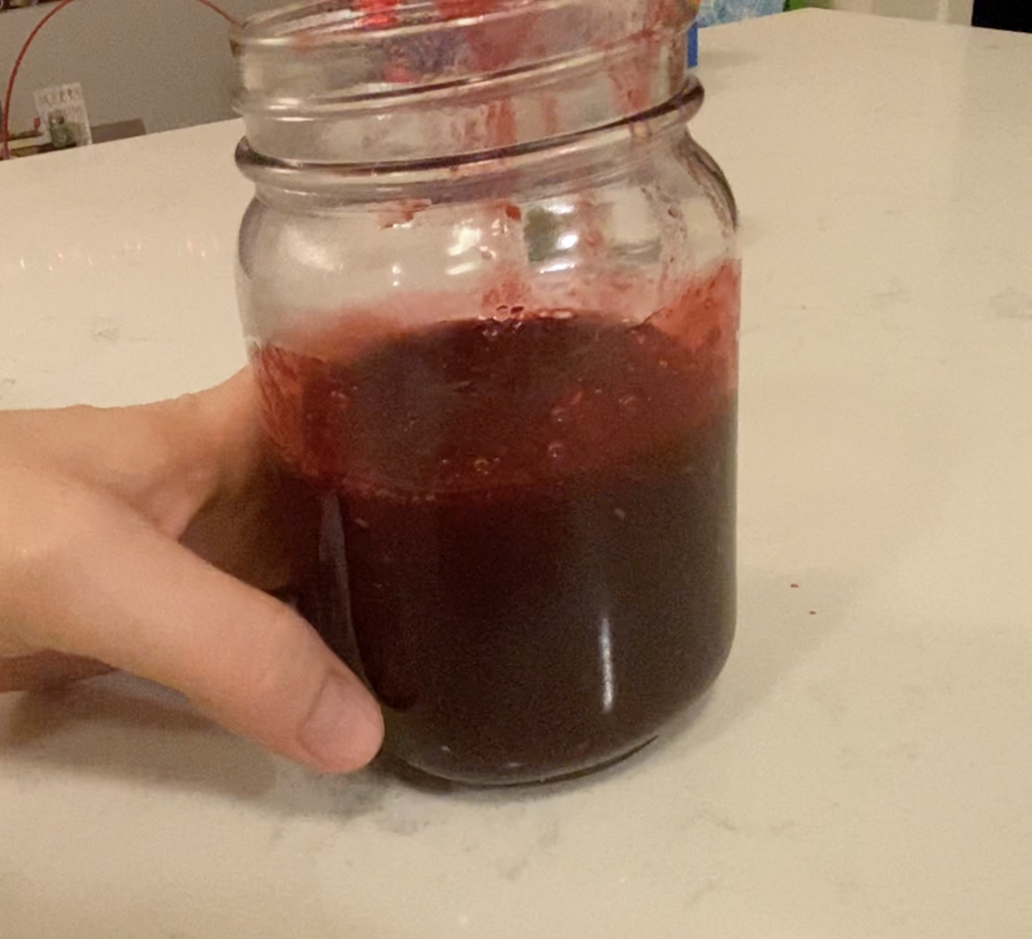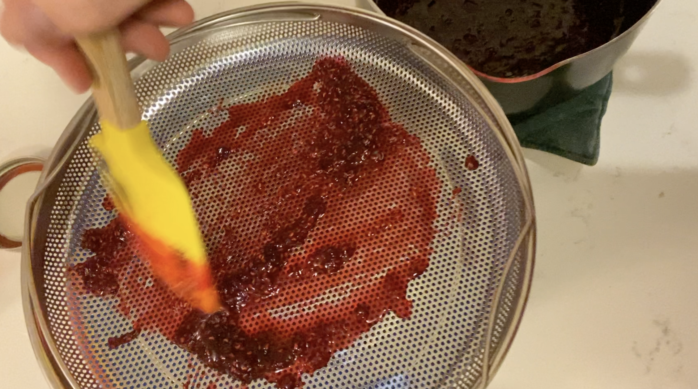 The next step was a messy one and took awhile – I wanted a smooth seedless jam so I pressed the jam through my metal sifter and then when that took too long, I used my metal steaming tray from my Our Place pan and that worked great. Once all the jam was pressed through the sieve and into a glass jar, I let it cool on the counter before placing it in the refrigerator over night.