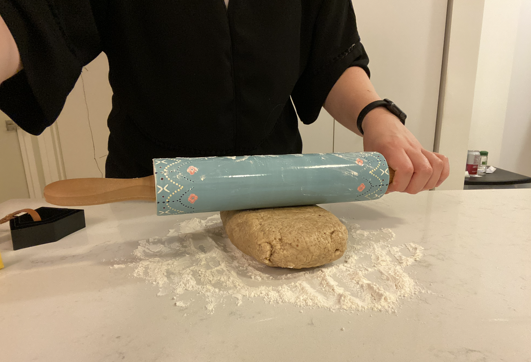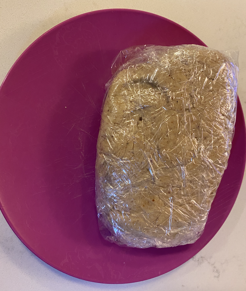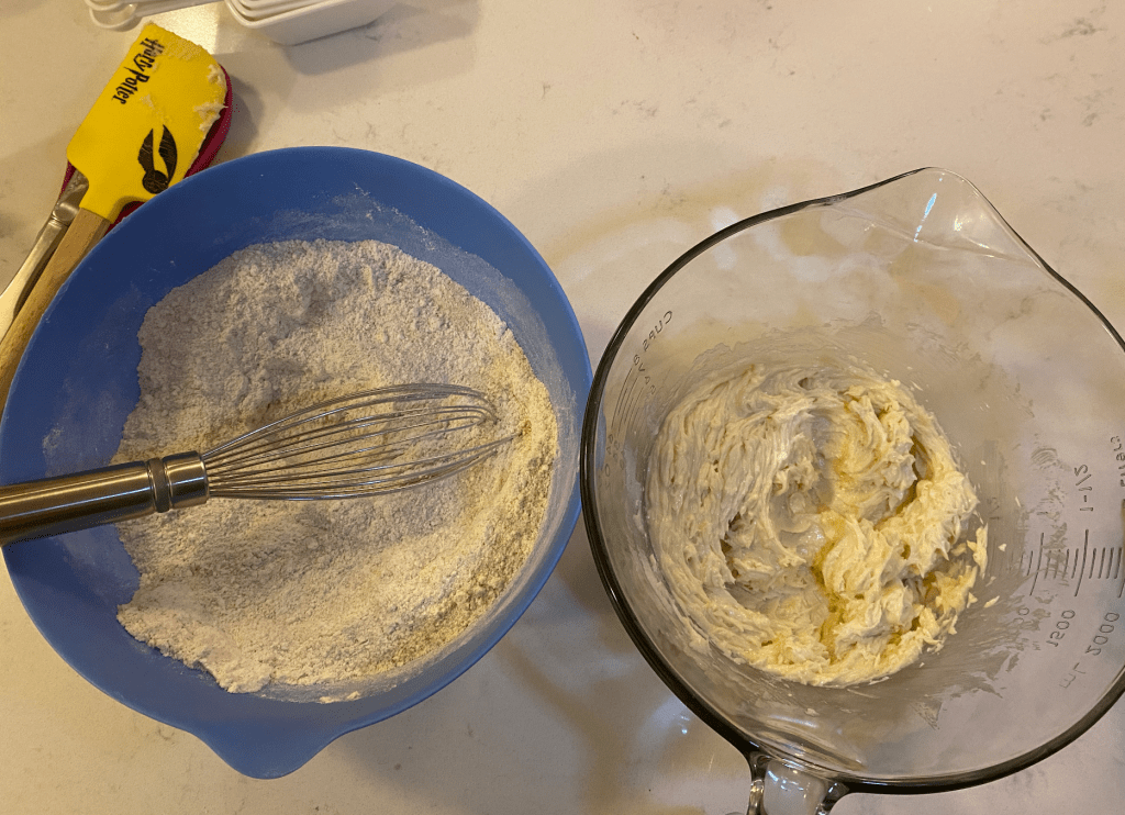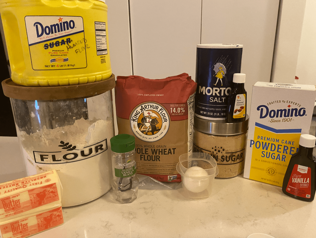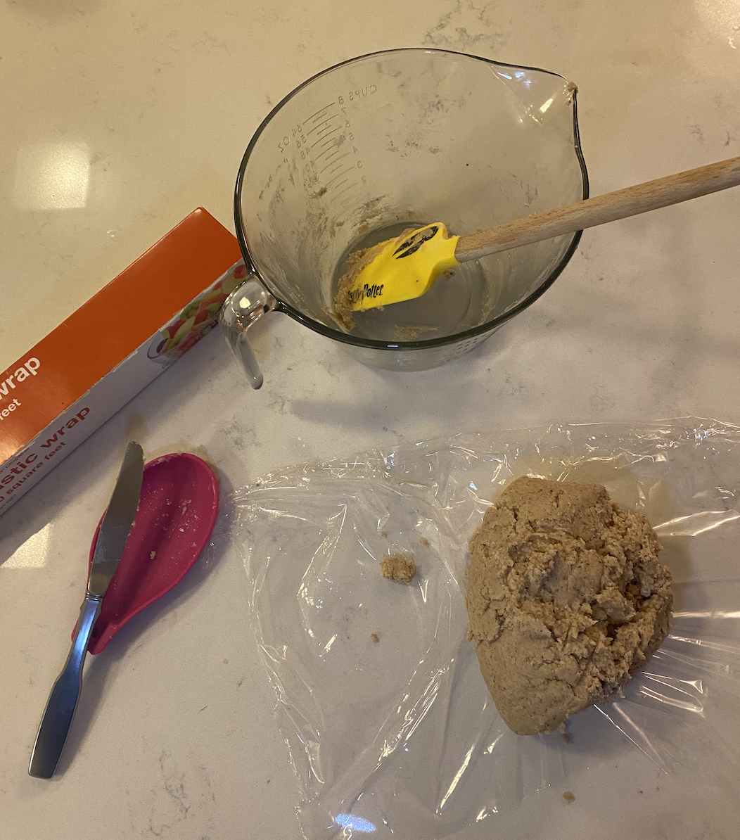 To make the cookies, the first step was to combine all of the dry ingredients, which were salt, regular all purpose flour, almond flour, and whole wheat flour into one bowl. In another bowl, I added the cup of butter and half of a cup of brown sugar and mixed those together until they were smooth. Then, an egg, a teaspoon of vanilla extract, and a teaspoon of almond extract were added into the mixture. Once the wet ingredients were together, I slowly added the bowl of dry ingredients until everything was thoroughly combined. I dumped the mixture onto a sheet of plastic wrap to create a disc shape and then placed it into the refrigerator to chill for a few hours.