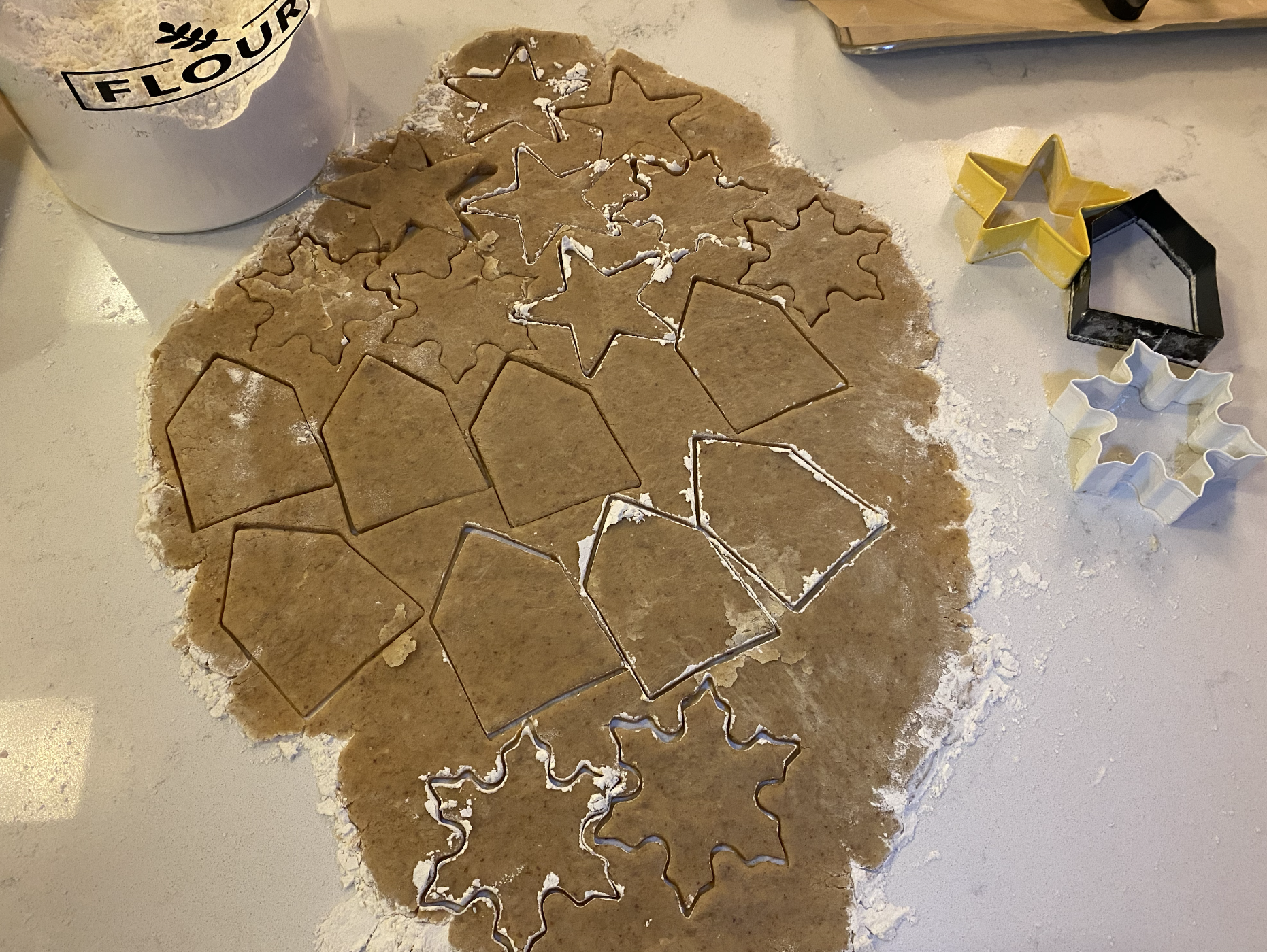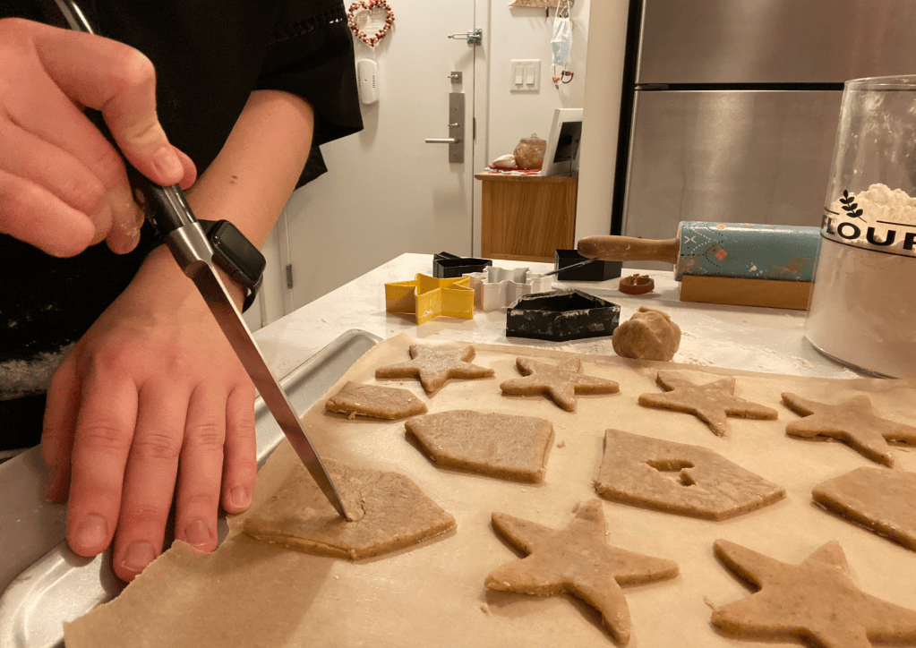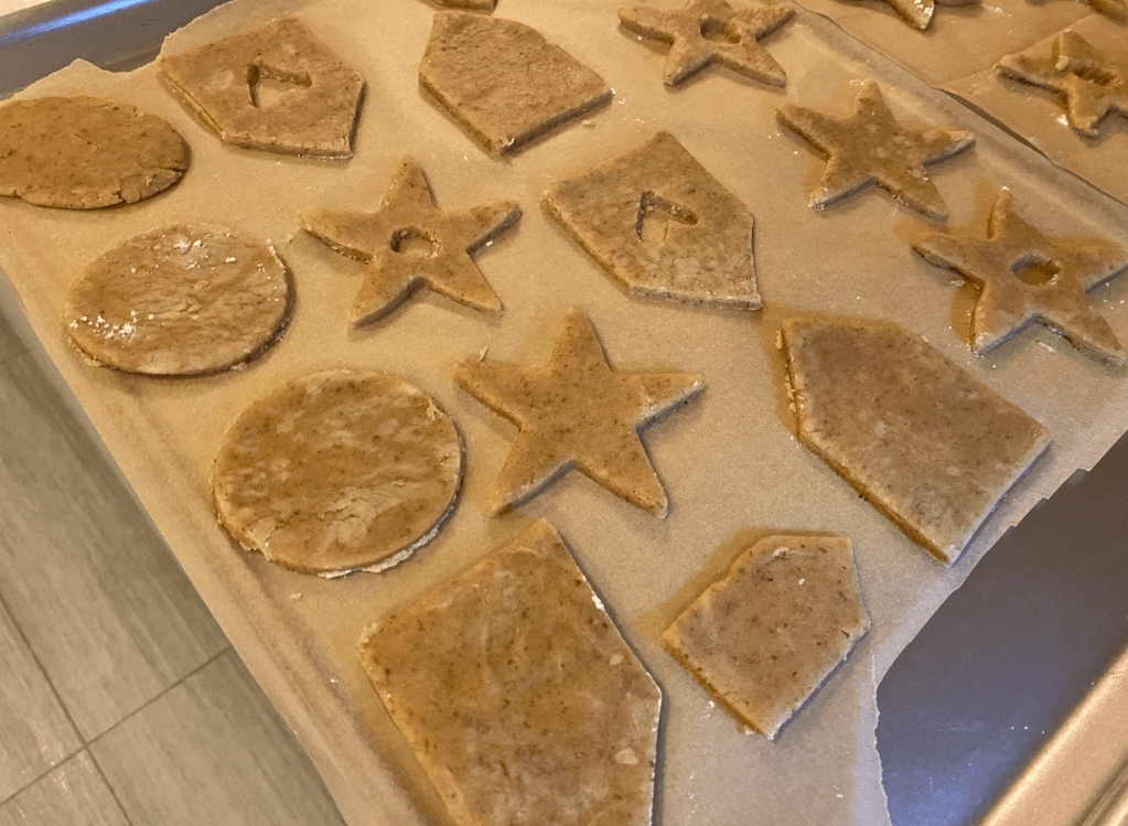 Later that day, I rolled out the dough onto my kitchen counter that I dusted with flour. I used snowflake, star, and house shaped cookie cutters and in half of the cutouts, I used a knife to scrape out a heart or a circle from the middle. They were placed onto parchment lined cookie sheets and baked in the oven at 350 (I actually had to make an educated guess about the temperature because the recipe skipped that detail) for about 8-11 minutes.
