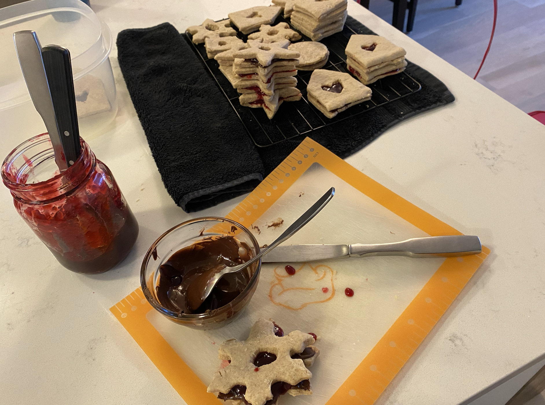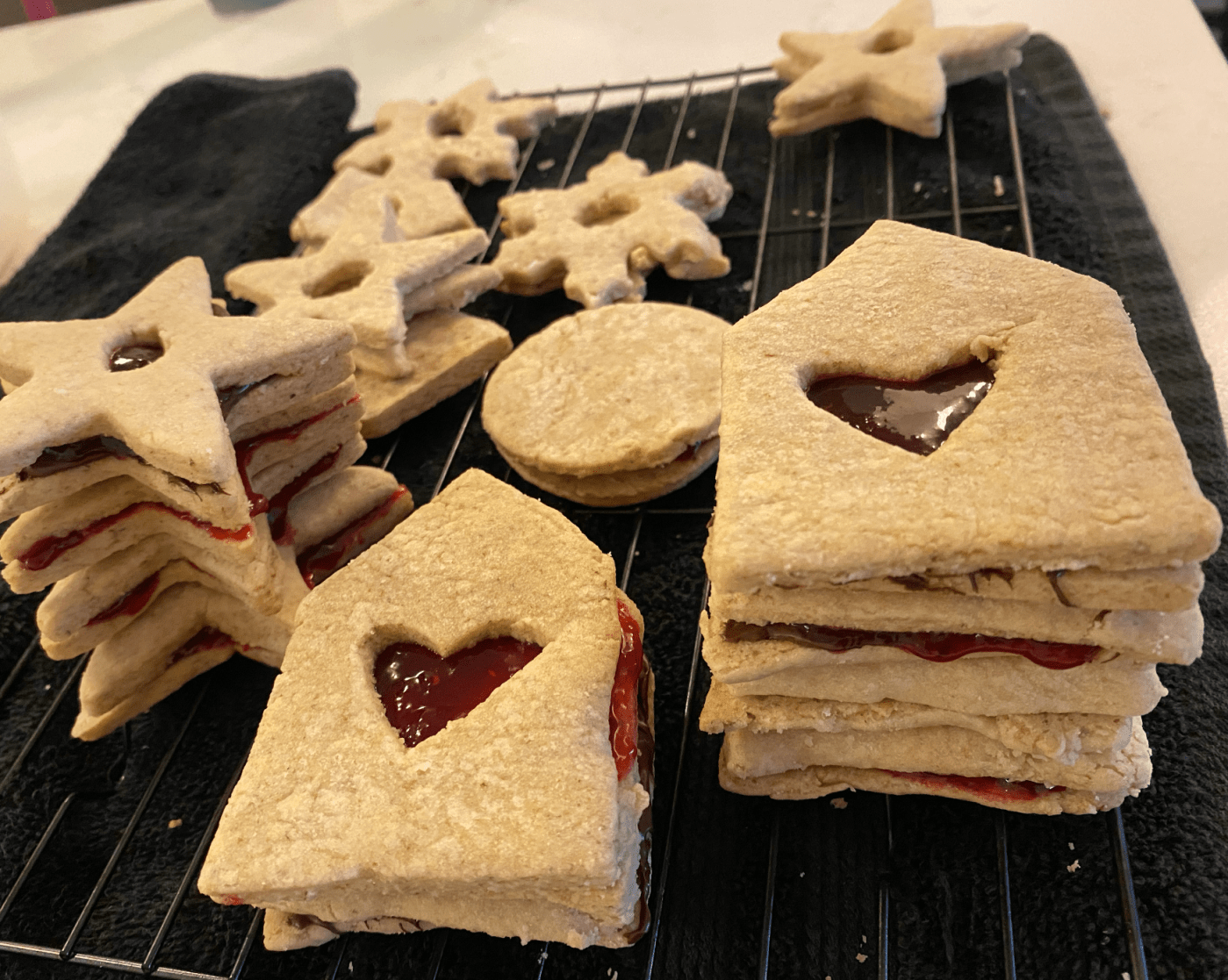 Once they were a nice golden brown, I laid them out onto a baking rack to cool completely. I didn’t want the heat from the cookies making a bigger mess by causing the jam to get runny.