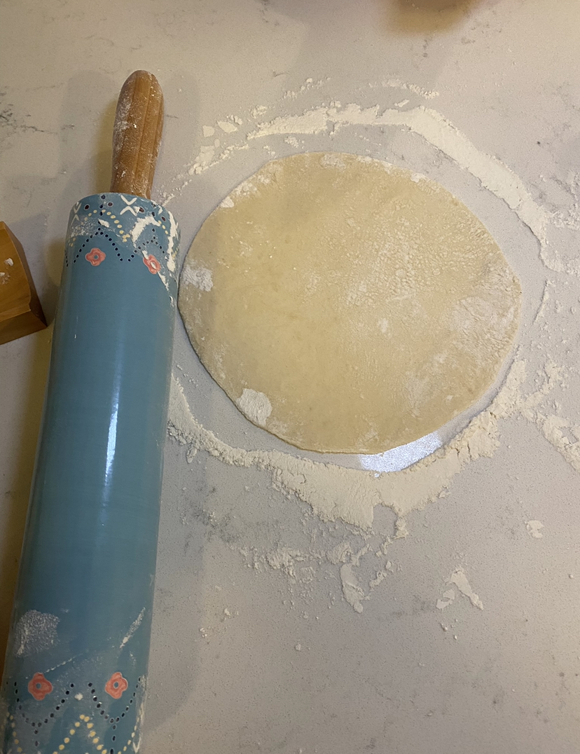 Once weighed, I placed each piece of dough onto the lightly floured surface and rolled it out to be about 7 or 8 inches in diameter.
