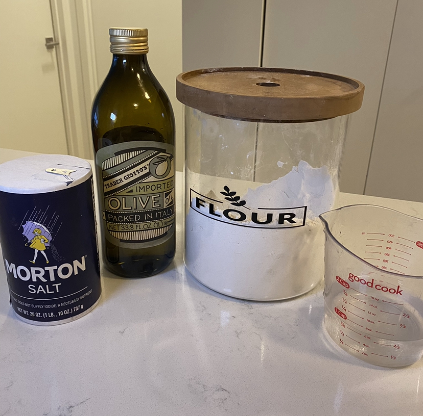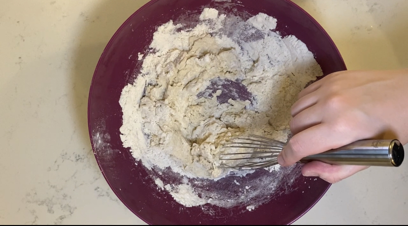 The first step was to mix together the two dry ingredients which were the two cups of flour with half a teaspoon of salt. Then, I stirred in 3/4 of a cup of water with 3 tablespoons of olive oil until the dough was starting to come together.