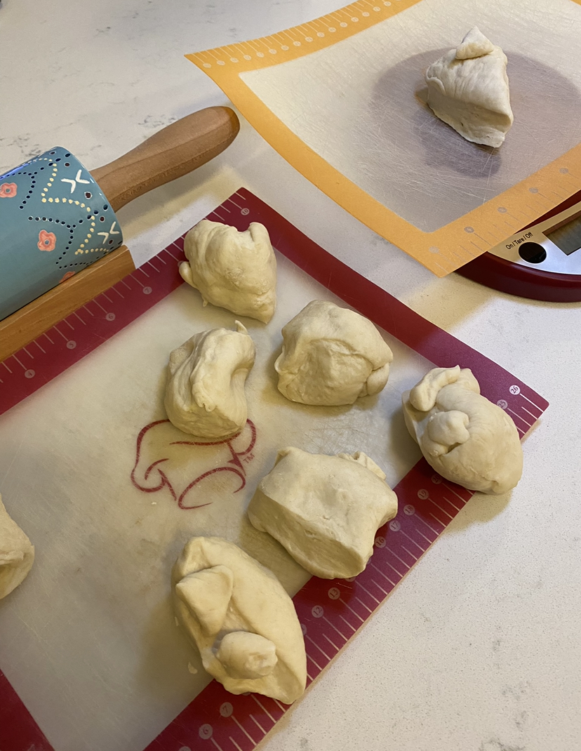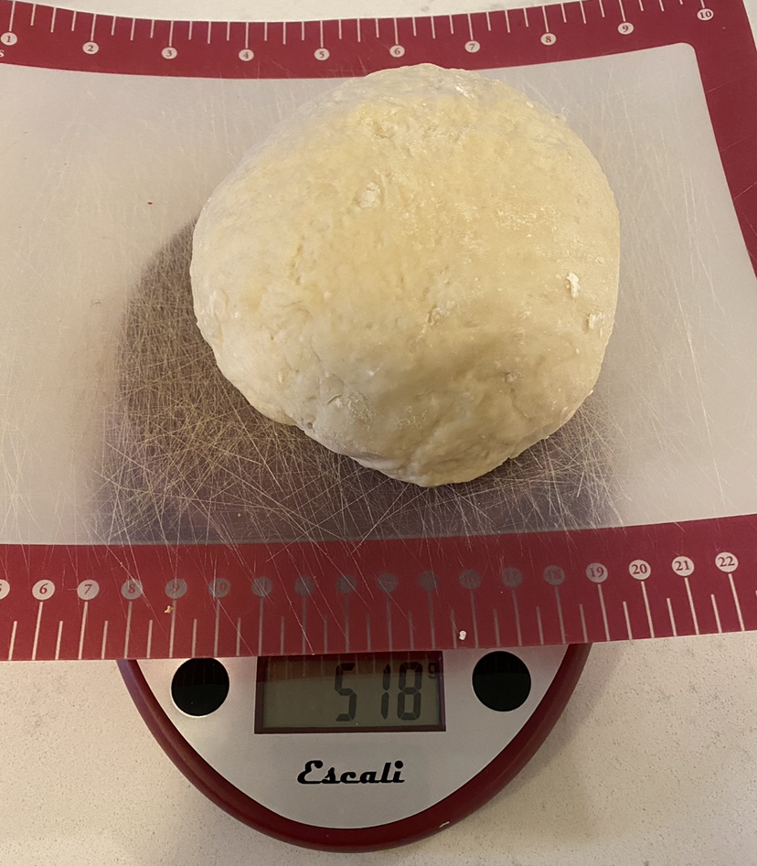 After the resting period, I cut the dough into about 8 even pieces. I used my food scale to make sure each piece was about the same size and weight. The entire ball weighed 518 grams so each piece was about 65 grams.